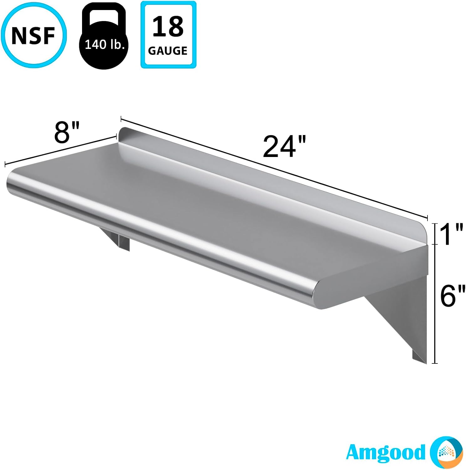 AmGood 8" X 24" Stainless Steel Wall Shelf | Metal Shelving | Garage, Laundry, Storage, Utility Room | NSF | Restaurant, Commercial Kitchen