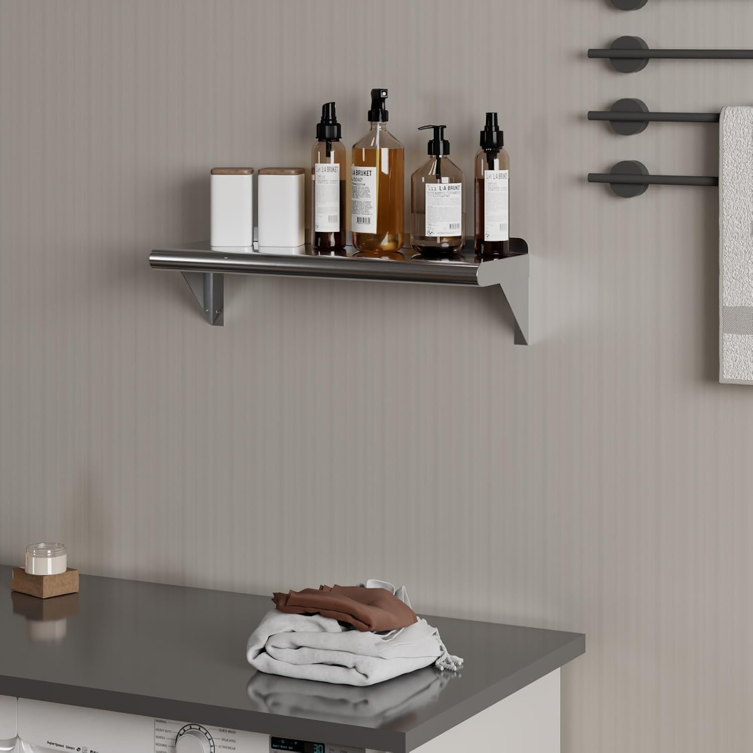 - Commercial grade heavy duty quality, Suitable for commercial and residential use, Easy to assemble and install. This corrosion resistant wall shelf can handle anything you throw at it and will last for years to come. Easy to clean and sterilize, metal shelves are superior to wood or glass. Food and liquid won’t get stuck or ruin the integrity of the surface. Easily wipe away excess with no fuss, mess, or contamination.