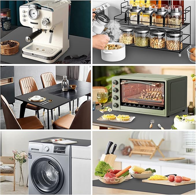 - You Can’t Go Wrong with It: This placemat can solve multiple problems. Great for catching messes. Protect counters from spills, scratches, grease, coffee stains, or damage. Place hot items of all sizes directly on the mat without having to dig through the drawer for a hot pad and no more need for trivets. Reduce the noises made by appliances. No need to worry about items slipping off the countertop. Tools will keep in place. Even if you are rolling dough hard on it, the mat won't slide