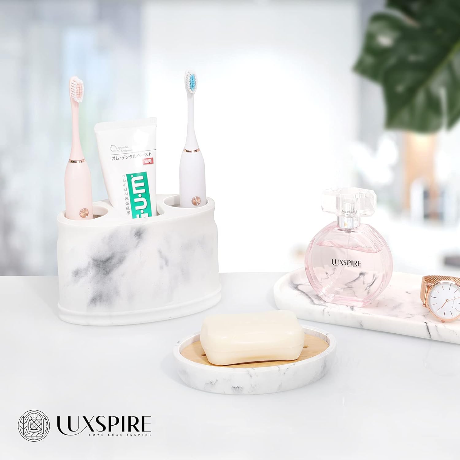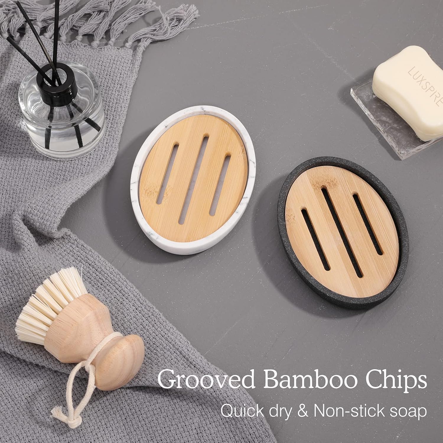 - Dual-layer Design: The Luxspire bamboo soap dish features a two-layer design and includes a bamboo chip that is easy to assemble. Please note that the bamboo chips will expand after absorbing water, causing them to be slightly smaller than the marble soap tray in size.