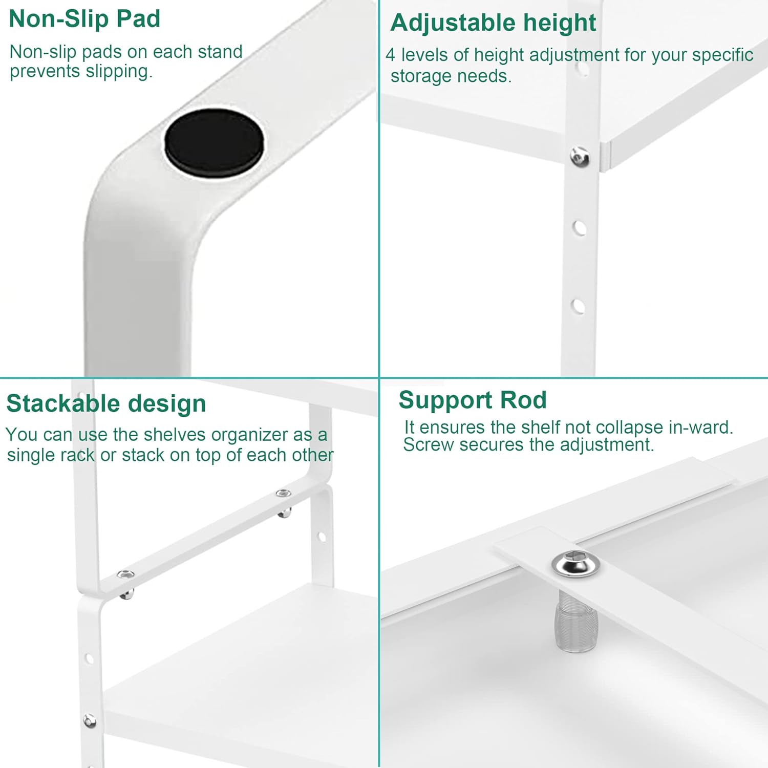 Redrubbit Expandable Cabinet Shelf Organizers, Stackable Kitchen Counter Shelves Spice Rack for Kitchen Bathroom Pantry Cupboard Desk Home Office, Metal Plate Heavy Duty Nonslip White, Set of 2