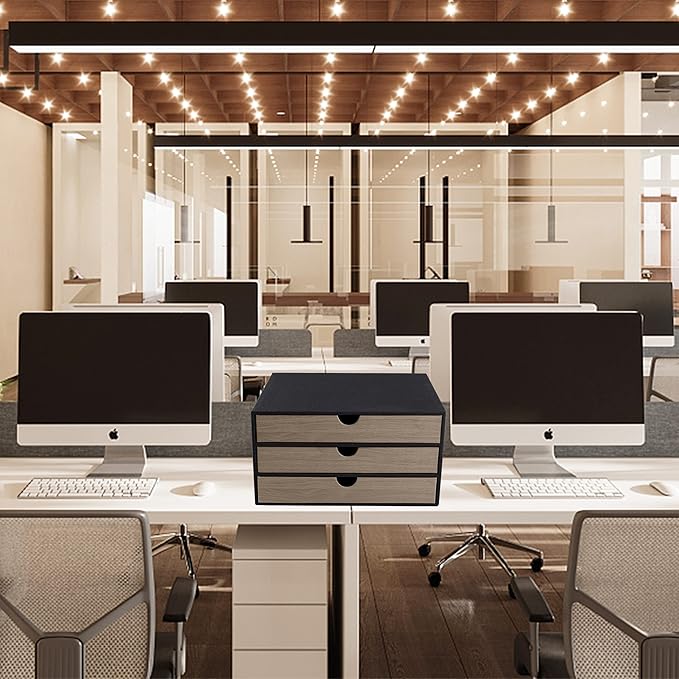 Fashion Multicolor Collocation Leather Desk Organizer File Cabinet Executive Office Supplies Desktop Filing A4 Contract Document Stackable Storage Box with 3 Drawers (Black)