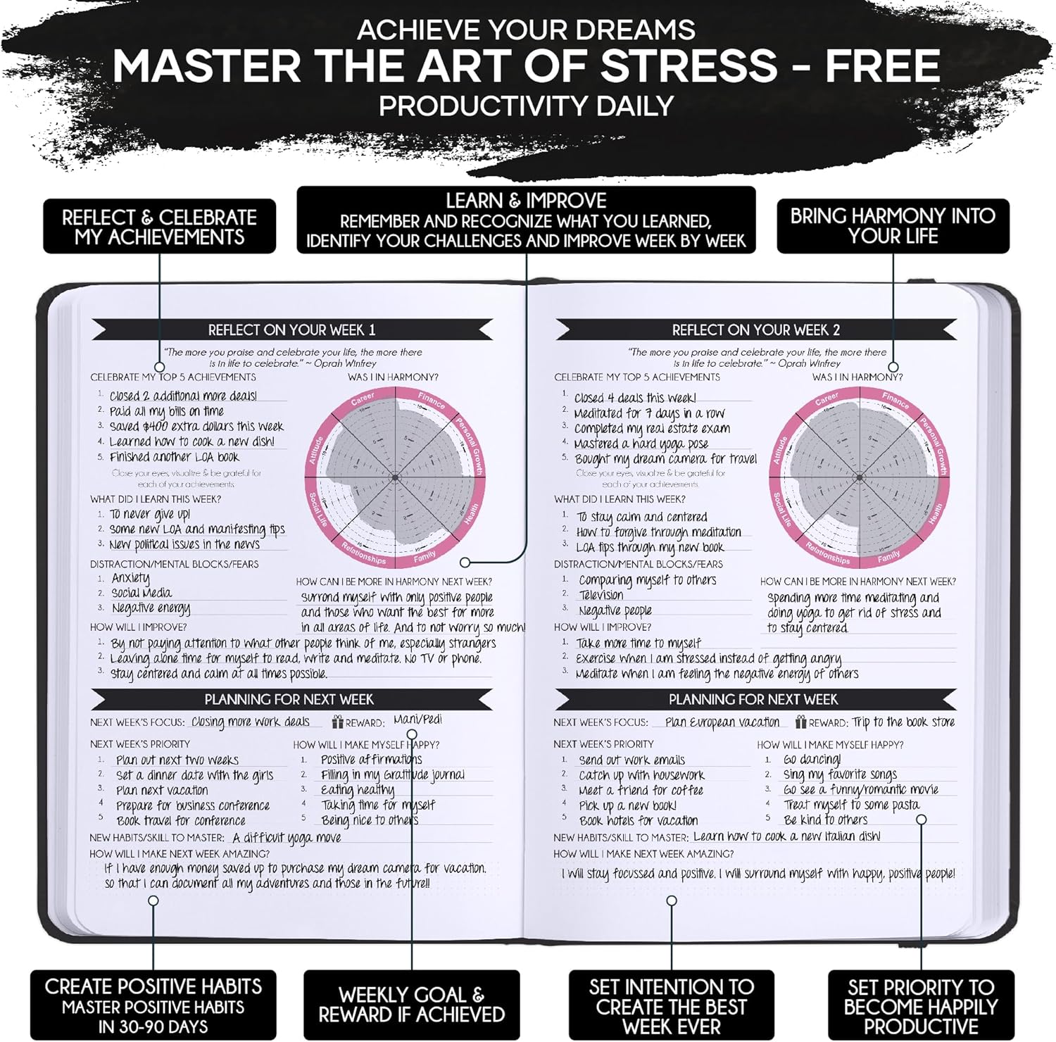 - LUXURIOUS AND TOP QUALITY - Self-care journal for women and men, perfect for entrepreneurs, professionals, college students and everyone who has burning desire to turn dreams into reality! FREE VIDEO MINI-COURSE: You will learn 10-min morning routine used by the most successful people to 10-fold your productivity, focus, happiness & passion! You will master setting goals & fix procrastination!