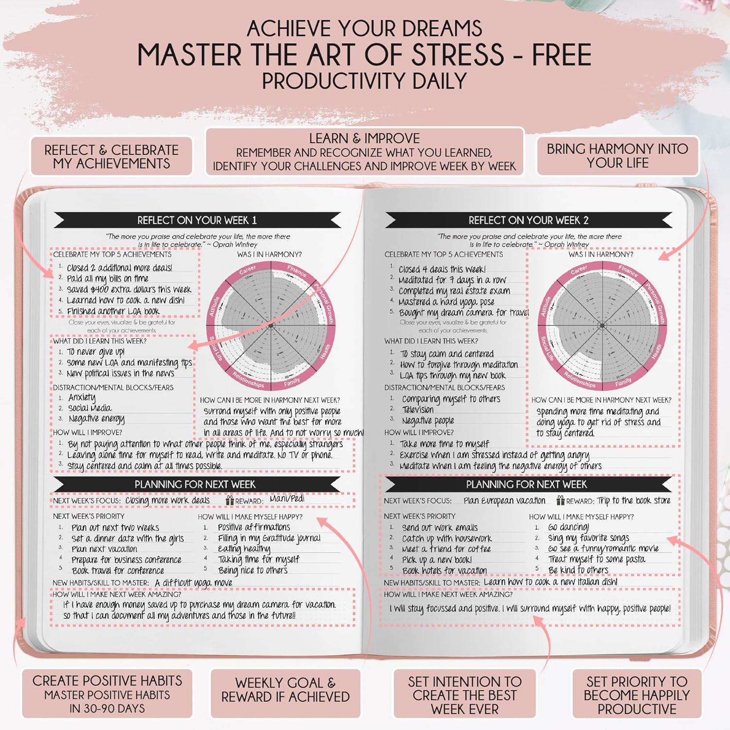 - LUXURIOUS AND TOP QUALITY - Self-care journal for women and men, perfect for entrepreneurs, professionals, college students and everyone who has burning desire to turn dreams into reality! FREE VIDEO MINI-COURSE: You will learn 10-min morning routine used by the most successful people to 10-fold your productivity, focus, happiness & passion! You will master setting goals & fix procrastination!
