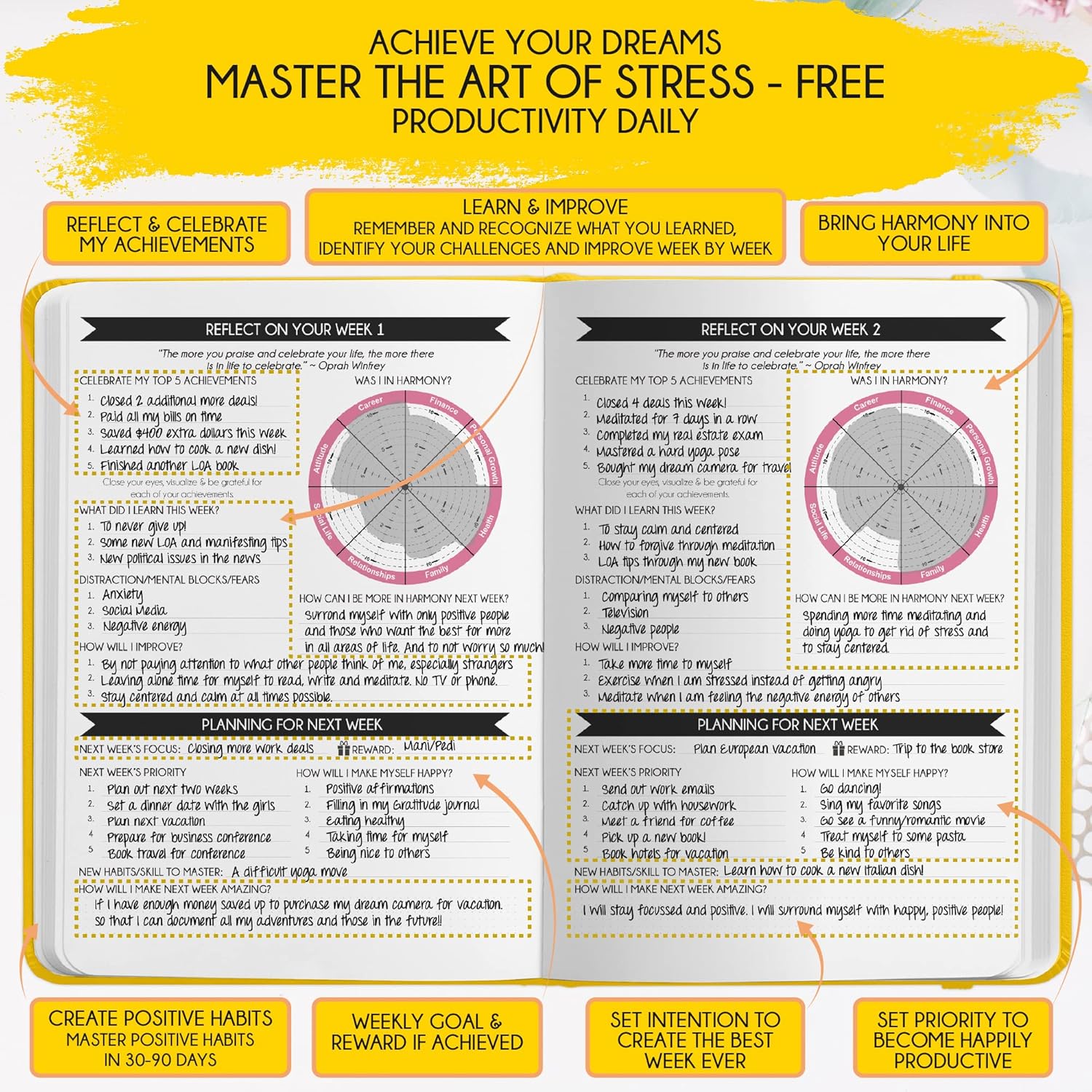- LUXURIOUS AND TOP QUALITY - Self-care journal for women and men, perfect for entrepreneurs, professionals, college students and everyone who has burning desire to turn dreams into reality! FREE VIDEO MINI-COURSE: You will learn 10-min morning routine used by the most successful people to 10-fold your productivity, focus, happiness & passion! You will master setting goals & fix procrastination!