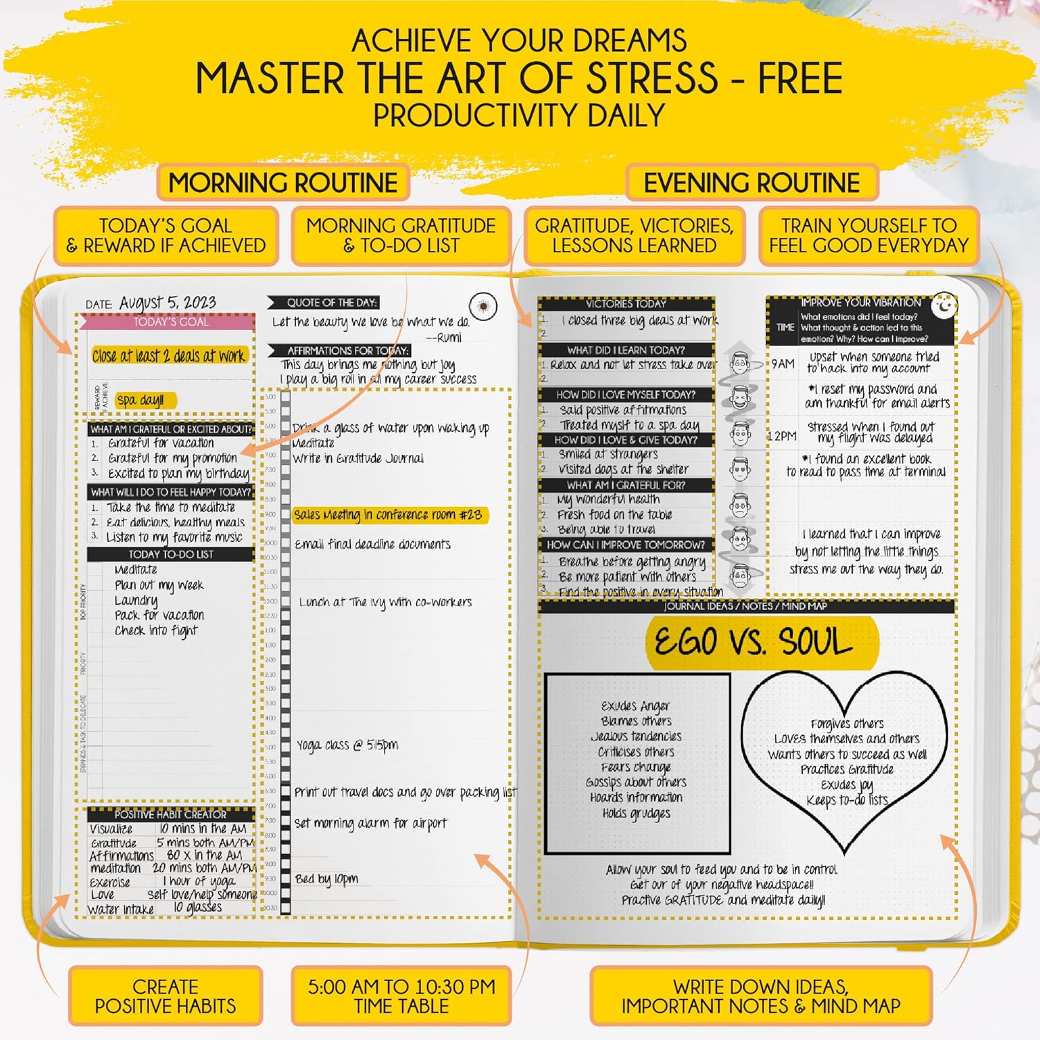- GUIDED JOURNAL – Increase your productivity and happiness. Learn to focus on top priorities and delegate effectively to achieve more and create free time for yourself. This daily planner includes To-Do Lists, a Feel-Good List, and a Gratitude Journal to prioritize self-care. Unlock your potential and master time management with the 5 Minute Journal, inspired by successful strategies worldwide. Follow the eight steps outlined in this planner to achieve remarkable results and discover your life purpose and passion.