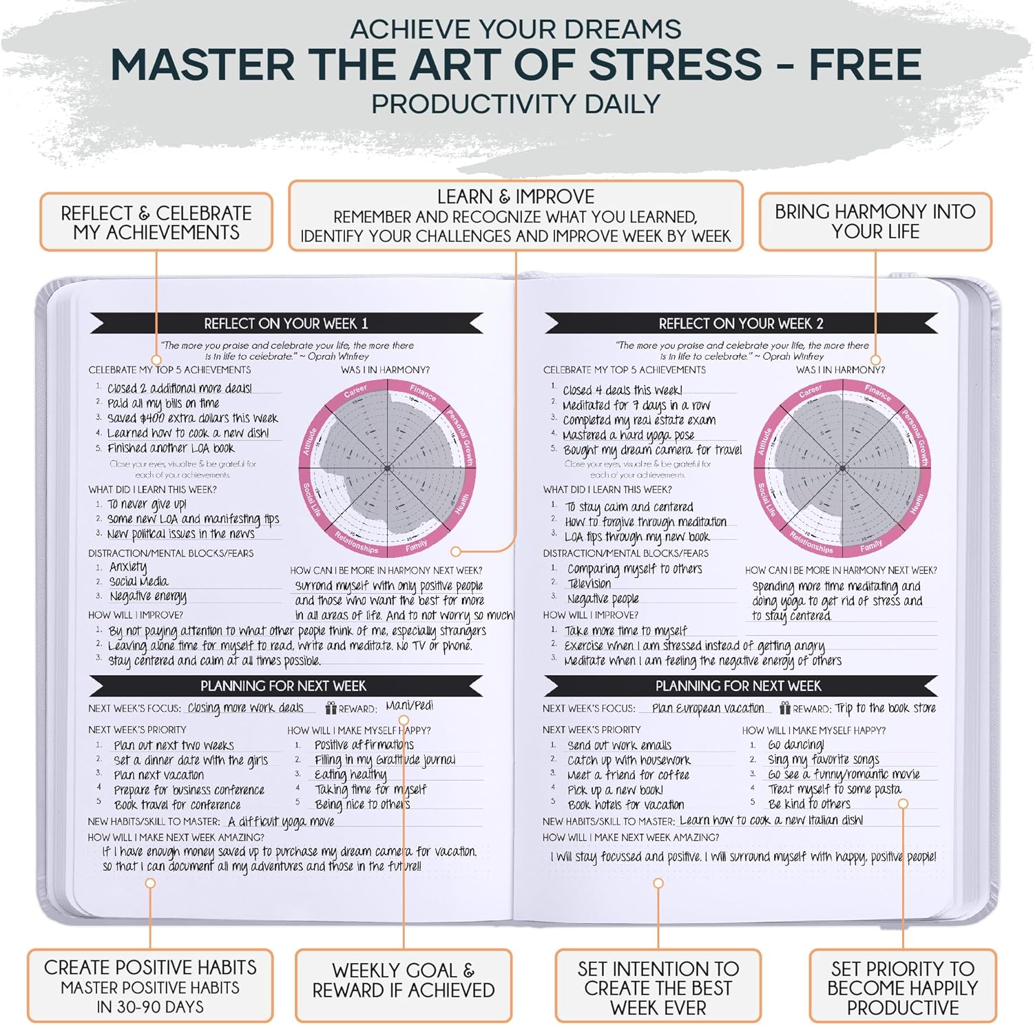 - GRATITUDE JOURNAL - This deluxe daily planner and gratitude journal for women comes in A5 size (5.8 x 8.3 inches). The life planner comprises 264 pages of thick 100 gsm paper, including 90 daily planning sheets, guiding you on how to become the best possible version of yourself on a mental, physical, and interpersonal level. It's a unique diary based on leading scientific studies proven to increase productivity and happiness. The journal features an out-foldable vision board to help you stay focused, morning and evening power questions, mind maps, reflection pages, habit trackers, a back pocket, and much more than any other planner on the market!