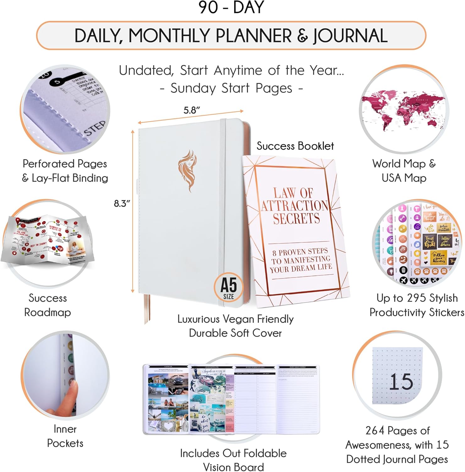 - GRATITUDE JOURNAL - This deluxe daily planner and self-care journal comes in A5 size (5.8 x 8.3 inches). The life planner comprises 264 pages of thick 100 gsm paper, including 90 daily planning sheets, guiding you on how to become the best possible version of yourself on a mental, physical, and interpersonal level. It's a unique diary based on leading scientific studies proven to increase productivity and happiness. The journal features an out-foldable vision board to help you stay focused, morning and evening power questions, mind maps, reflection pages, habit trackers, a back pocket, and much more than any other planner on the market!