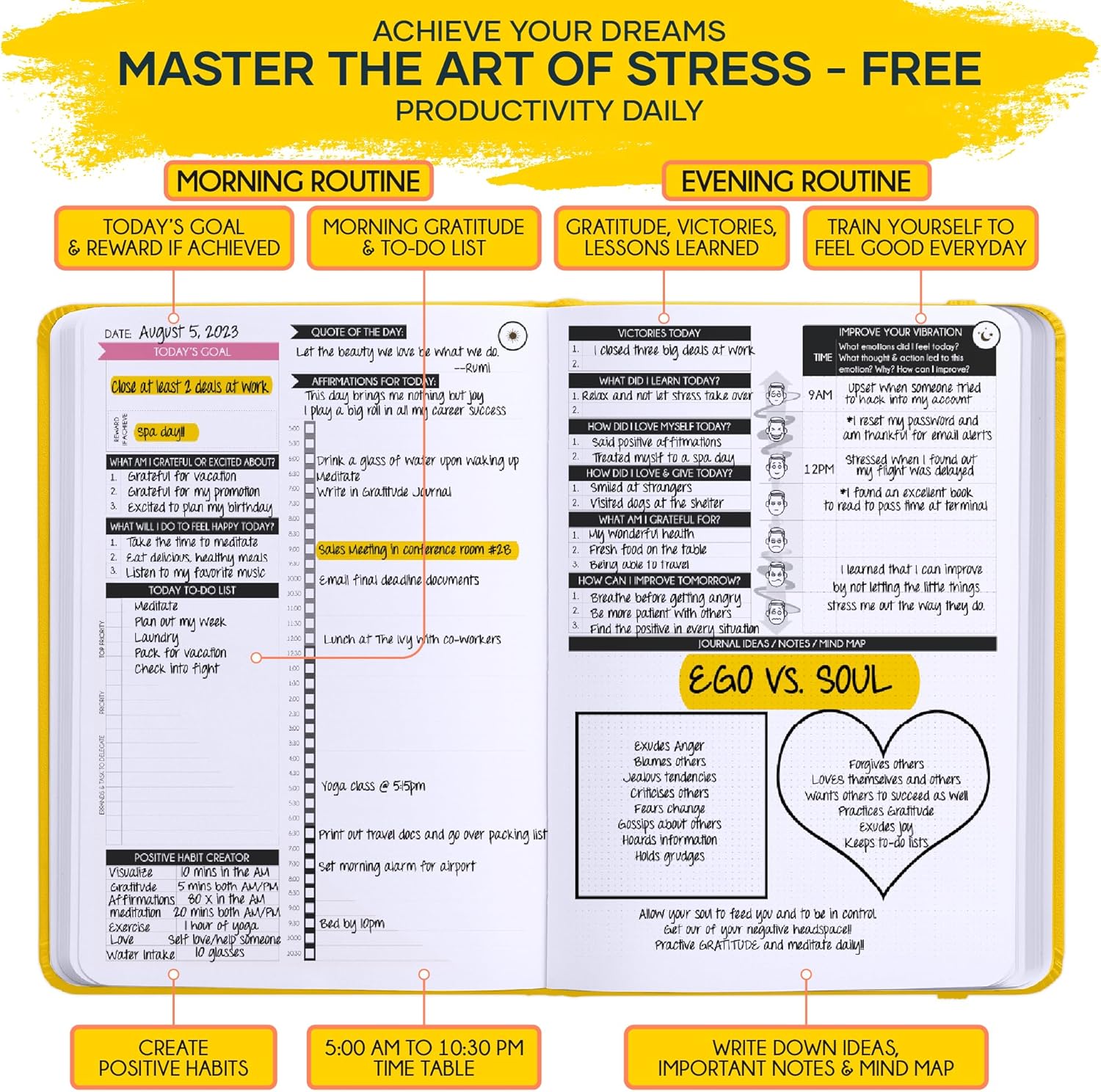 - GUIDED JOURNAL – Increase your productivity and happiness. Learn to focus on top priorities and delegate effectively to achieve more and create free time for yourself. This daily planner includes To-Do Lists, a Feel-Good List, and a Gratitude Journal to prioritize self-care. Unlock your potential and master time management with the 5 Minute Journal, inspired by successful strategies worldwide. Follow the eight steps outlined in this planner to achieve remarkable results and discover your life purpose and passion.