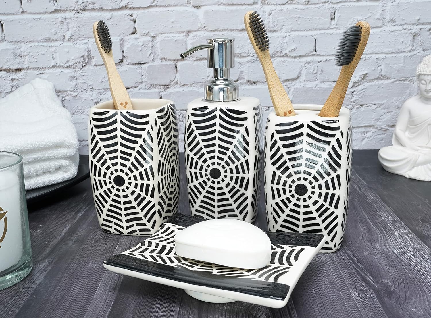- "HANDMADE CLASSY DESIGN: Adds style and elegance to your bathroom counter, earn compliments from guests, each design painted on the beautiful surface by artisan hands, The bath set is a classic contemporary design in that can be added to any bathroom decor to make it look elegant and organized."