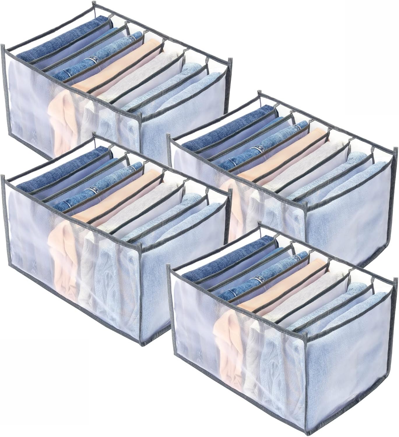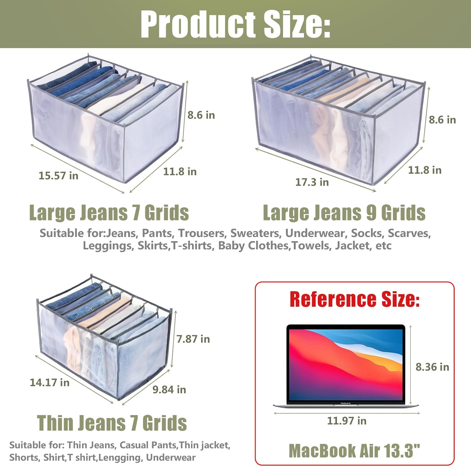 - Size of clothing organizer: The jean organizer for closet has many size designs, which can meet all your storage needs(Thin Jeans 7 Grids Size:14.17*9.84*7.87 inch; Large Jeans 9 Grids Size: 17.3*11.8*8.6 inches) . Tips: For very large pants, we suggest you buy the large Jeans 9 Grids Size type