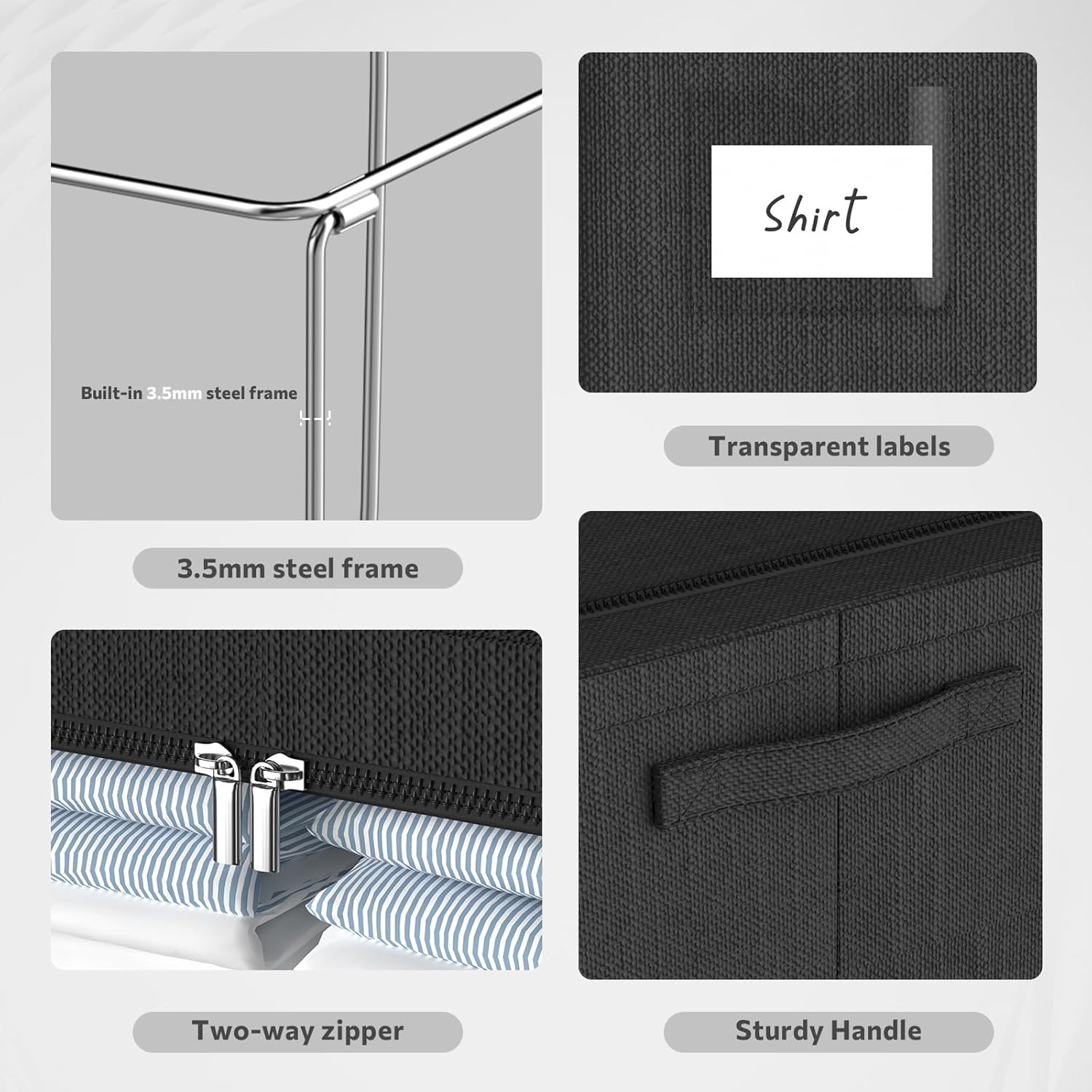 Clothes Storage Bins Box - Linen Fabric Foldable Stackable Container Organizer Set with Clear Window & Carry Handles & Metal Frame (Black, Large-66L)