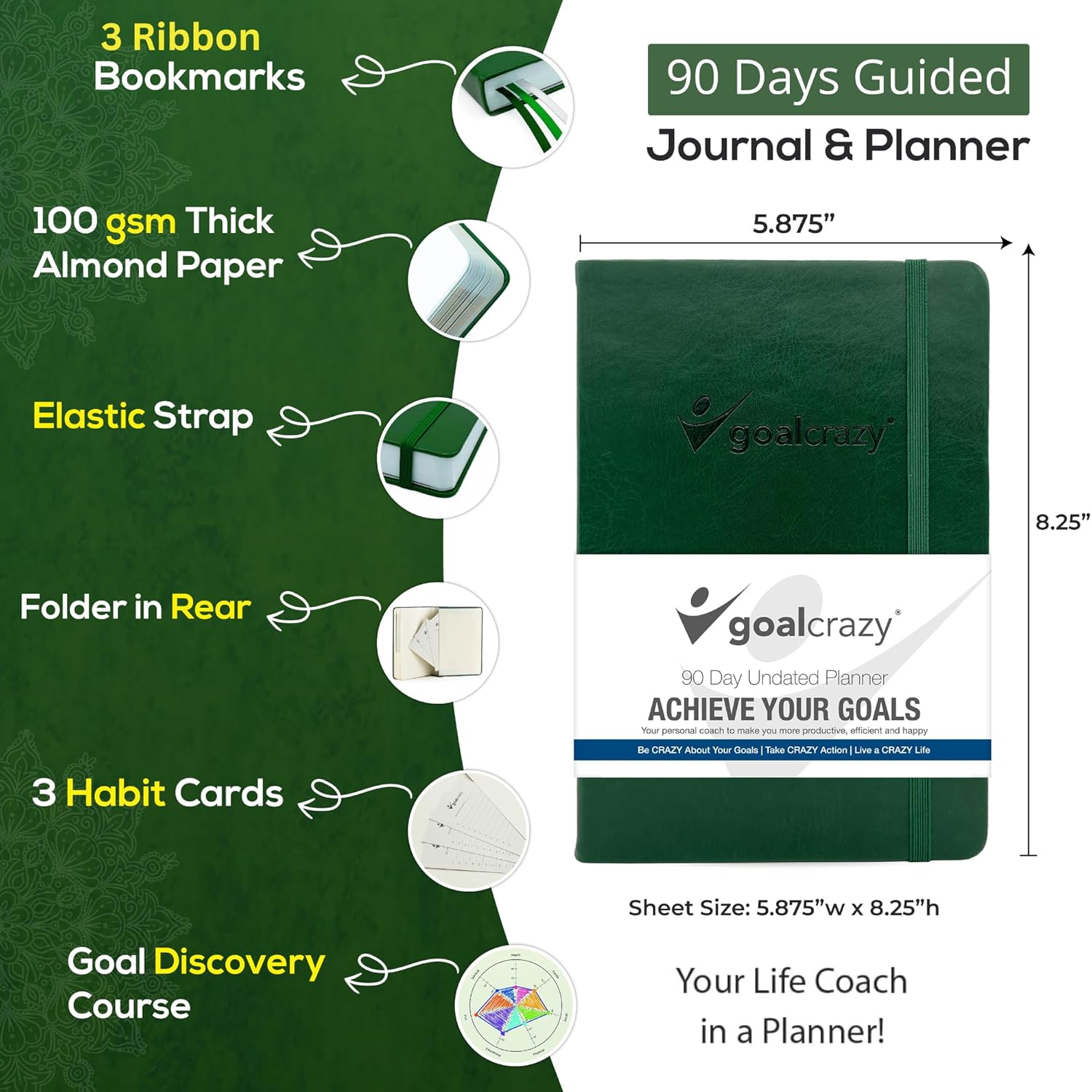 Undated Daily Planner to Achieve Your Goals 2025-2026 - 90 Day Guided Journal & Productivity Organizer with Goal Setting, Habit Tracker, To Do List, Academic & Work Calendar, Leather Hardcover - Forest Green