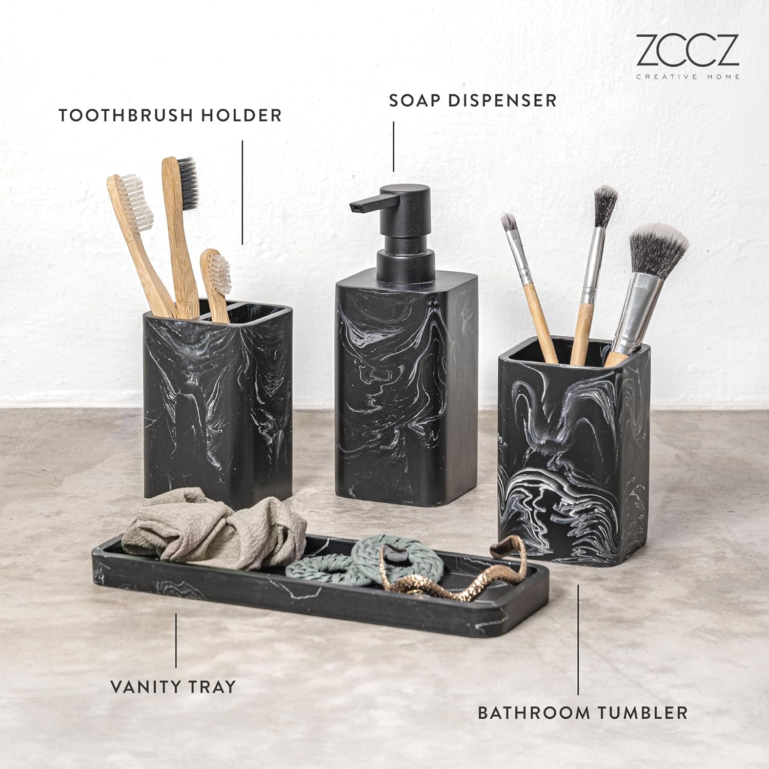 ZCCZ Black Bathroom Accessory Sets, 4 Pieces Bathroom Accessories Complete Set Vanity Countertop Accessory Set Marble Look, Includes Lotion Dispenser Soap Pump, Tumbler, Toothbrush Holder and Tray