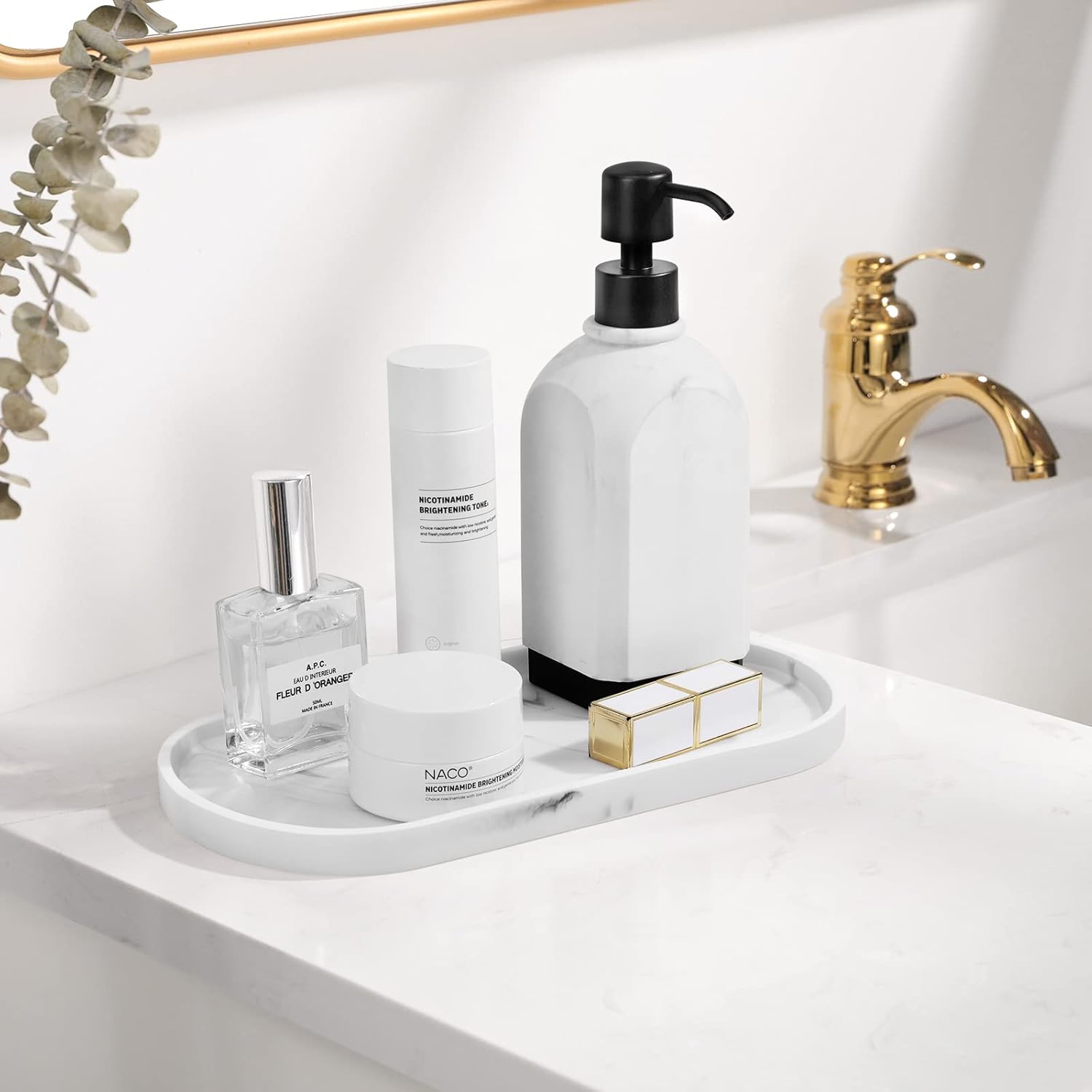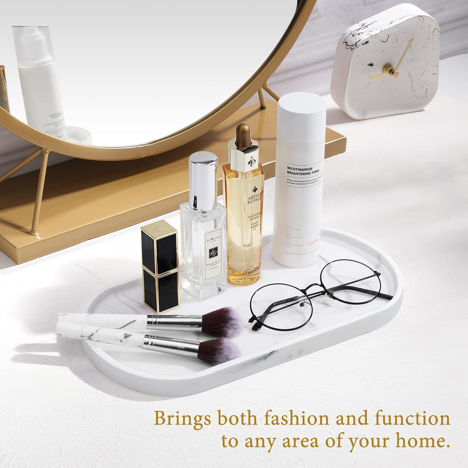 - SAVE SPACE: The tray is perfect for neatly arranging your shampoo, lotion bottles, cosmetics, toiletries and other vanity essentials, which is big enough to hold your items without taking up too much space on your dresser. NOTE: Clean with a damp cloth or water(0-104℉).
