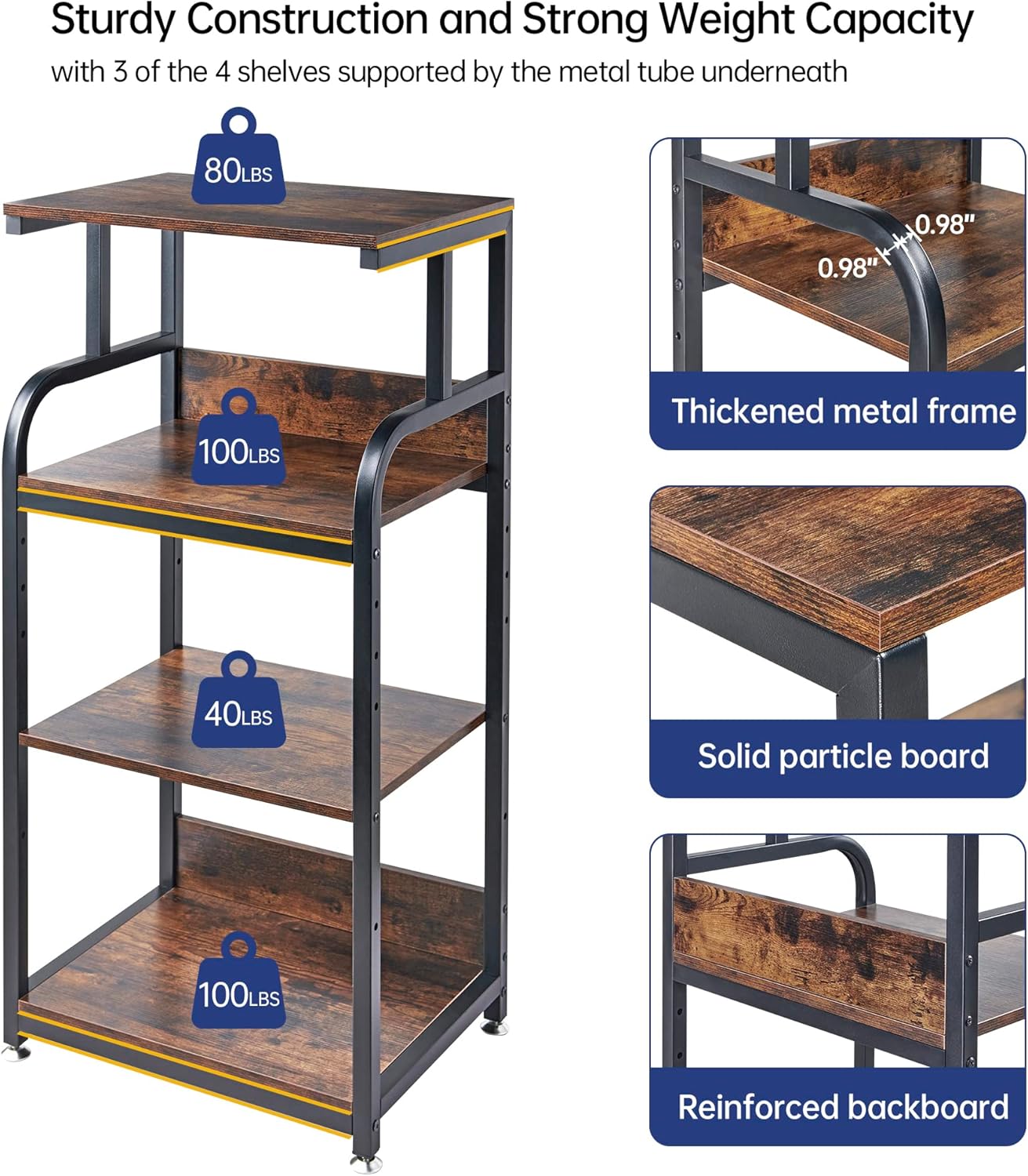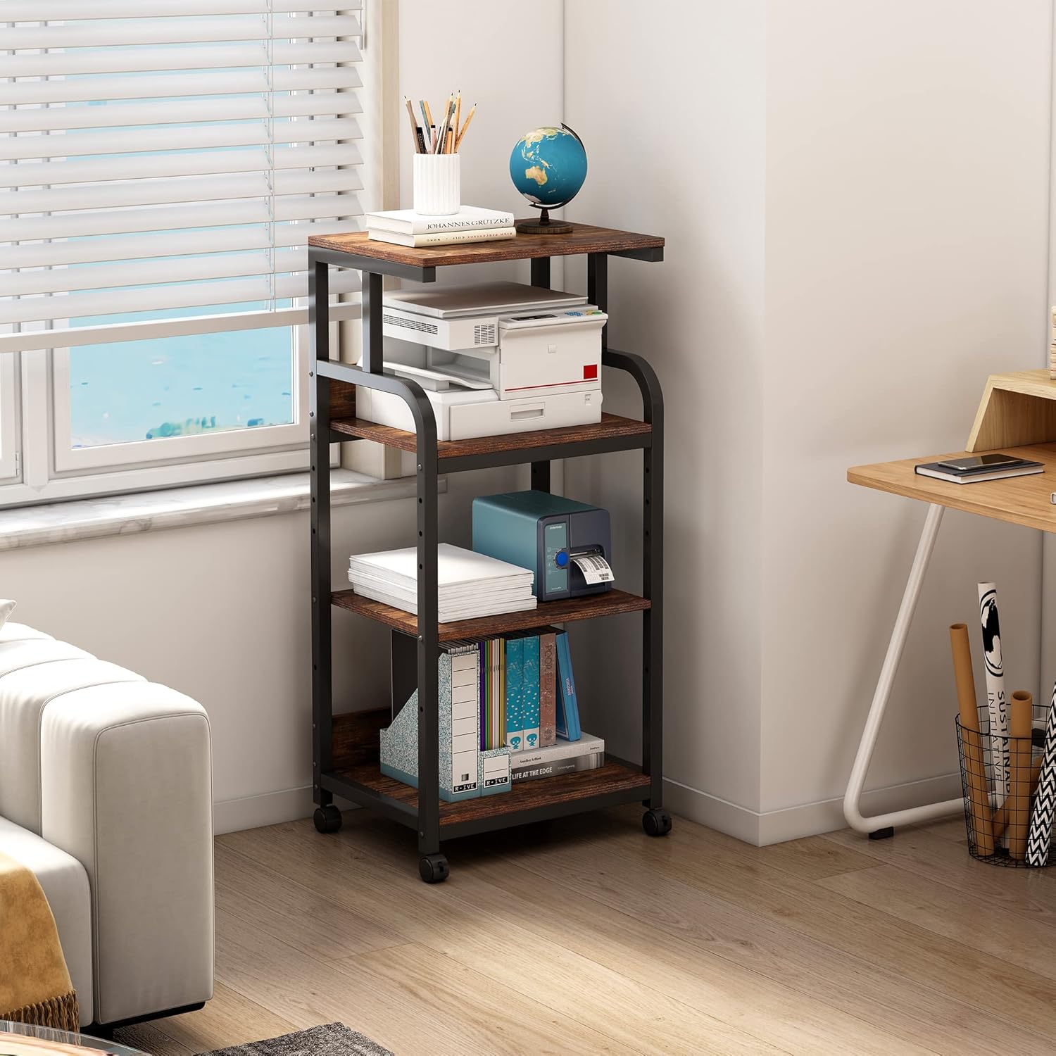 4-Tier Printer Stand with Adjustable Storage Shelf, Large Tall Printer Table with Wheels for Home Office Small Spaces Organization, Rustic Brown