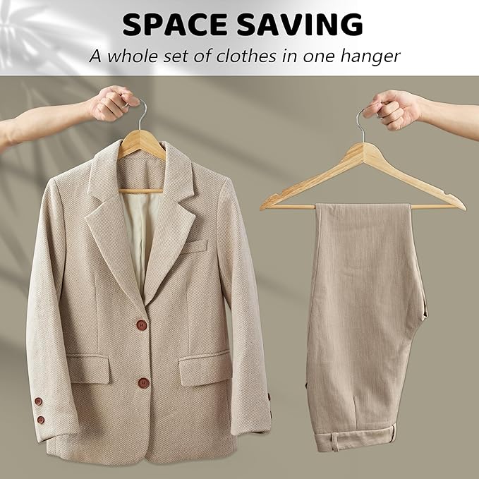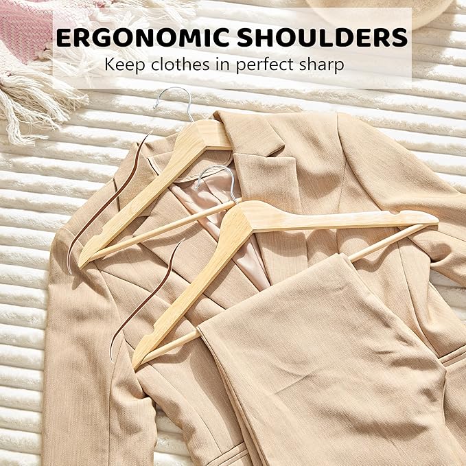 - Hand Polished Smooth Surface & Ergonomic Shoulder Design: With double hand-sanding craft without burr, the surface of wooden clothes hangers becomes smooth and protect your clothes from snagging. A contoured shoulder line on the coat hangers for closet, helps your clothes stay in original shape, keeping shoulder no bulges.