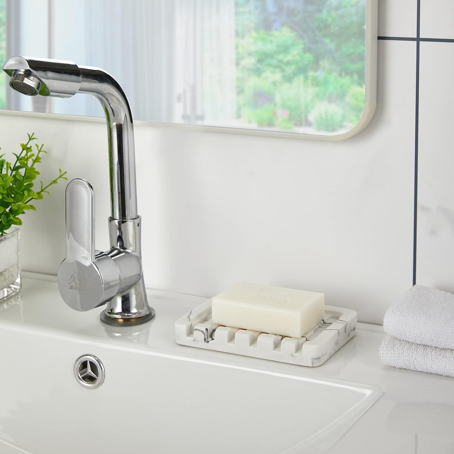 Self Draining Soap Dish - Marble Look Soap Holder Tray Savers Box Container Sponge Holder for Bathroom Shower Kitchen, White