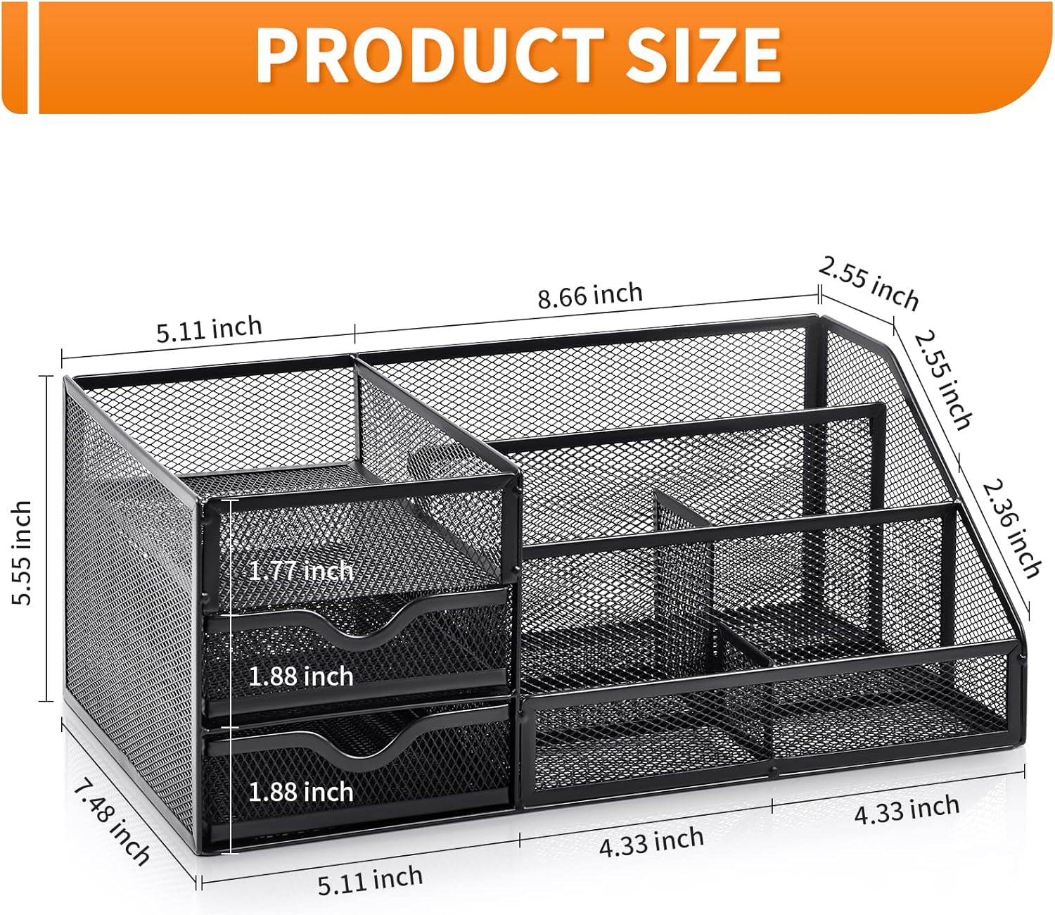 - Unique Design: Simple and generous design, the protective design ensures no sharp edges. This mesh desktop organizer is an all-in-one construction giving it a more functional storage performance which is convenient for storing and organizing small items on office desks, at home, on vanity, and so on, helping you to save space, and make your desk look more neat and clean