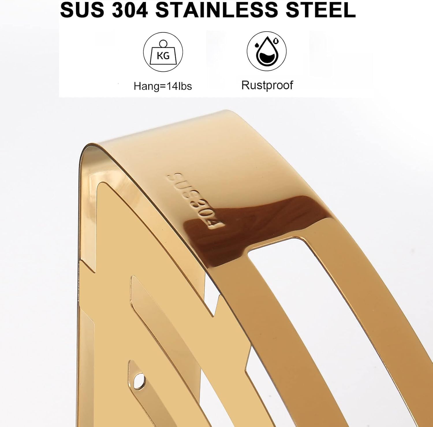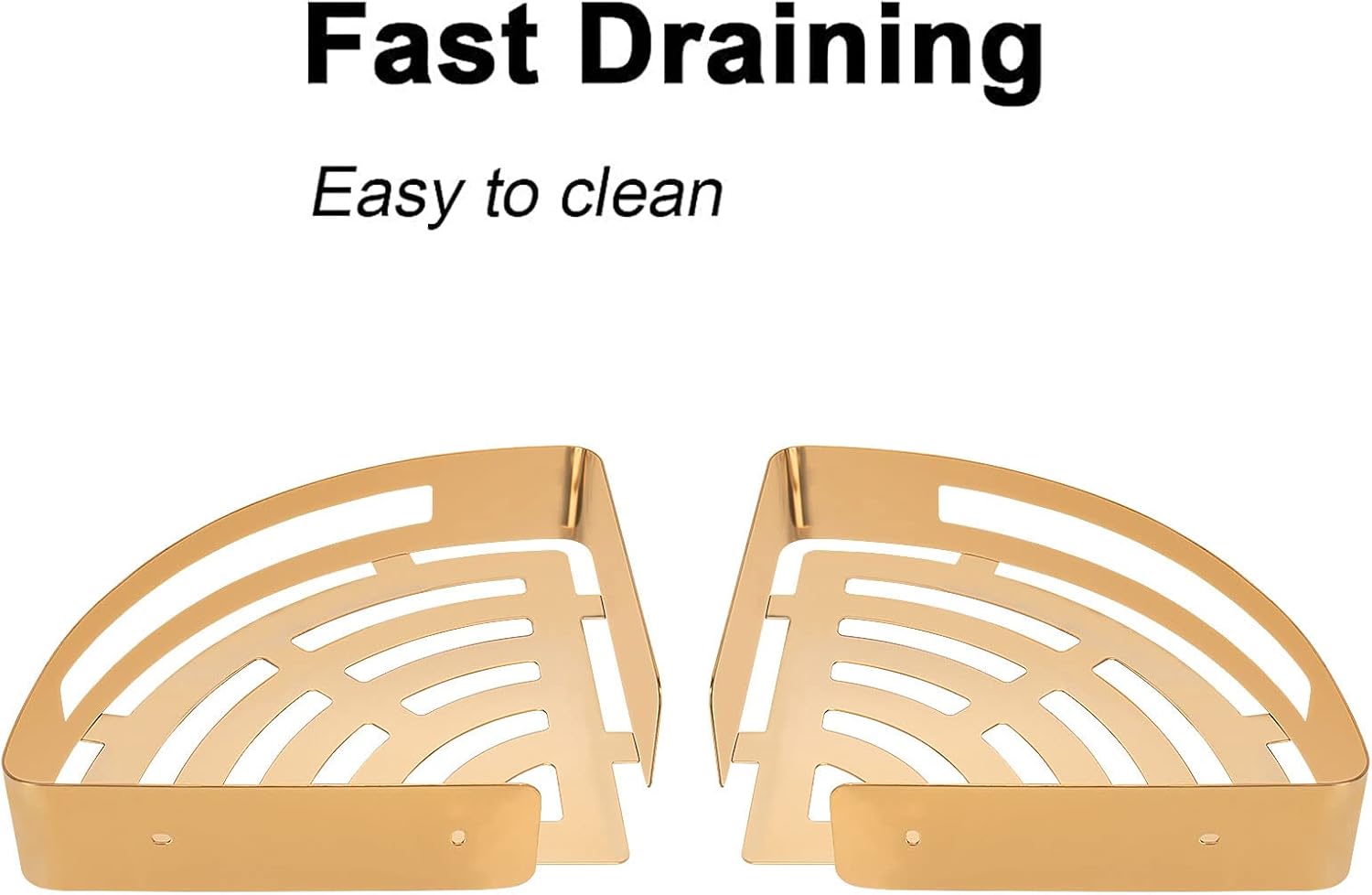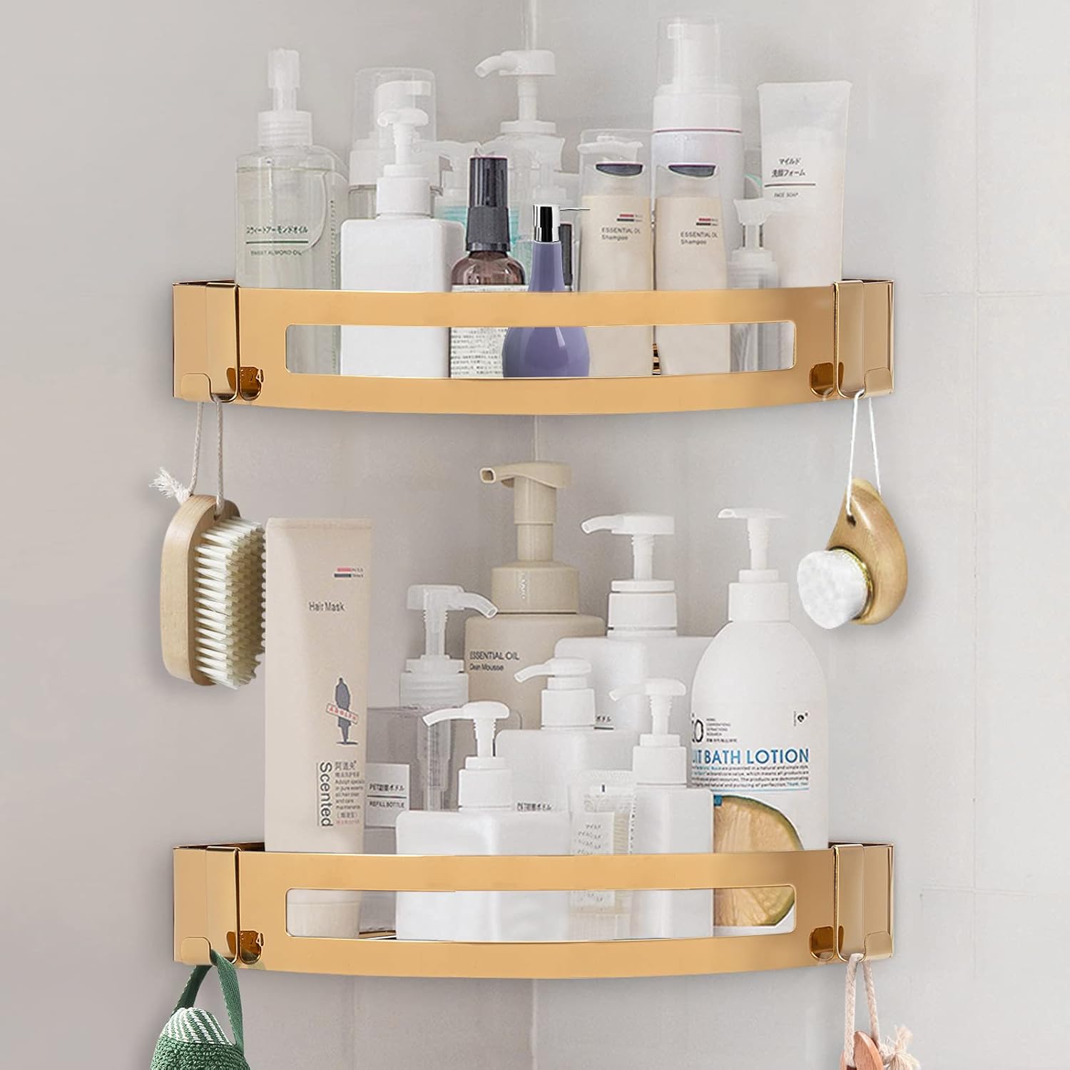 NearMoon Bathroom Shower Caddy 2 Pack, No Drill 304 Stainless Steel Shower Organizer with 2 Hooks (Corner Shelf, Gold)