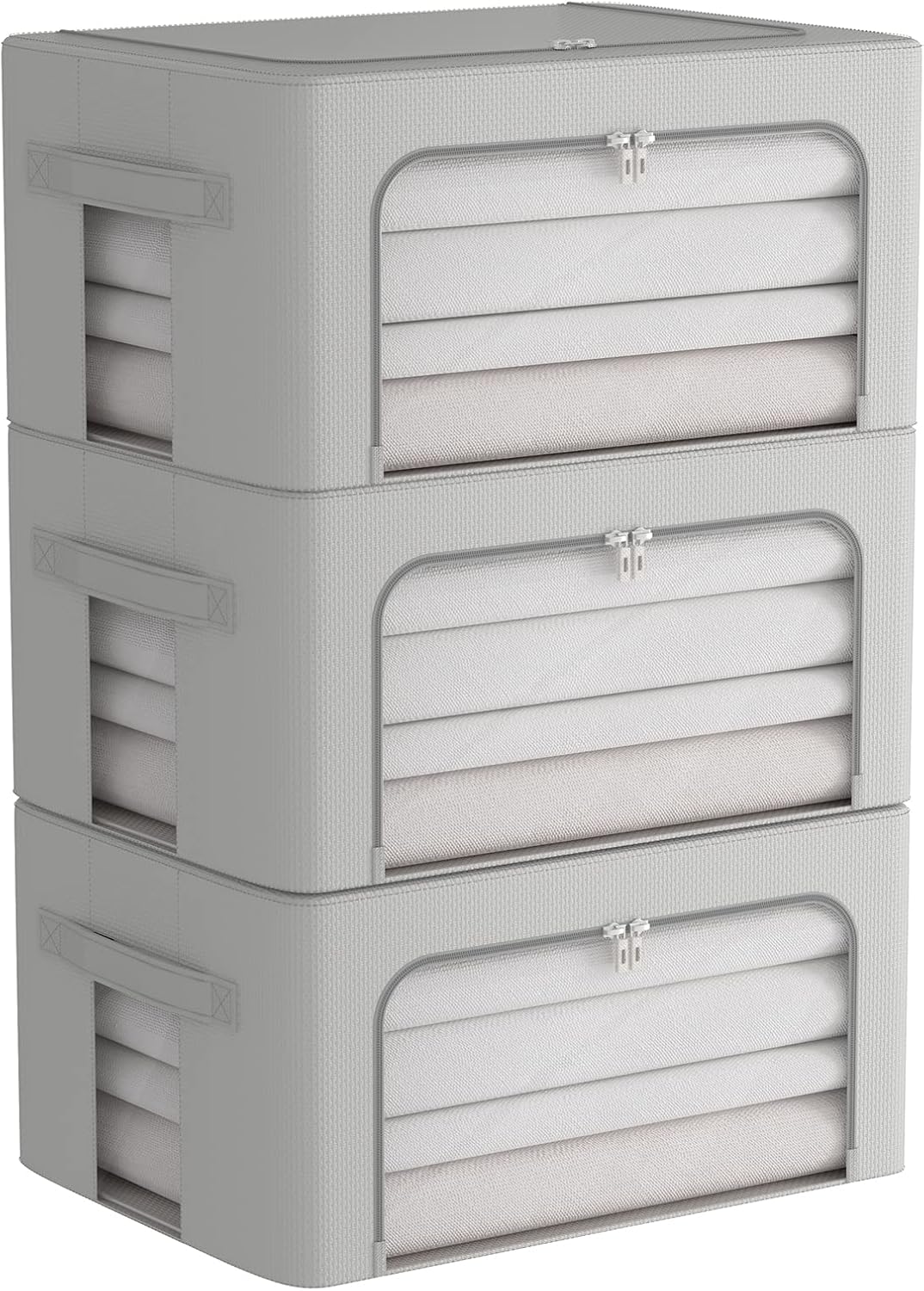 3Pack Frame Storage Box - Clothes Storage Bin Bags Oxford Fabric Foldable Stackable Container Organizer Set with Clear Window & Carry Handles (Grey, Medium-44L)