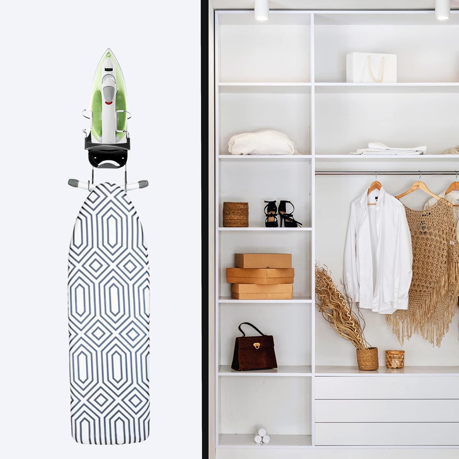 - 【Space Saver】 This iron board hanger maximizes space and eliminates laundry room clutter with this clever wall-mounted solution. There is a wire storage slot at the bottom to help you organize long wires. 2 hooks below can store T-shaped or V-shaped ironing board to save space and keep your laundry room tidy.