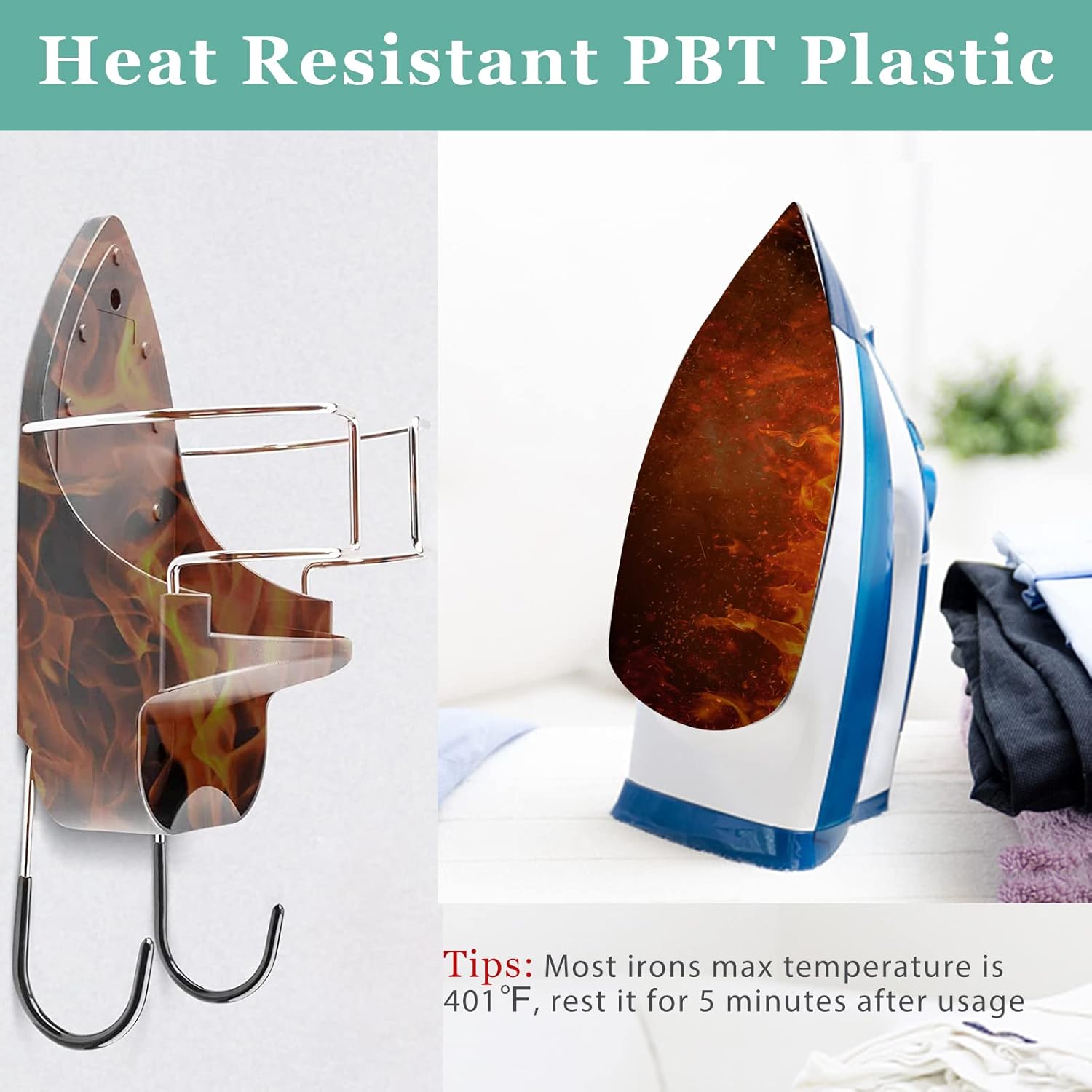 - 【Heat Resistant up to 392℉】The iron board holder adopts PBT anti-flame retardant material, which can with stand high temperature of 392℉. Tips: Most irons max temperature is 401℉, rest it for 5 minutes after usage.