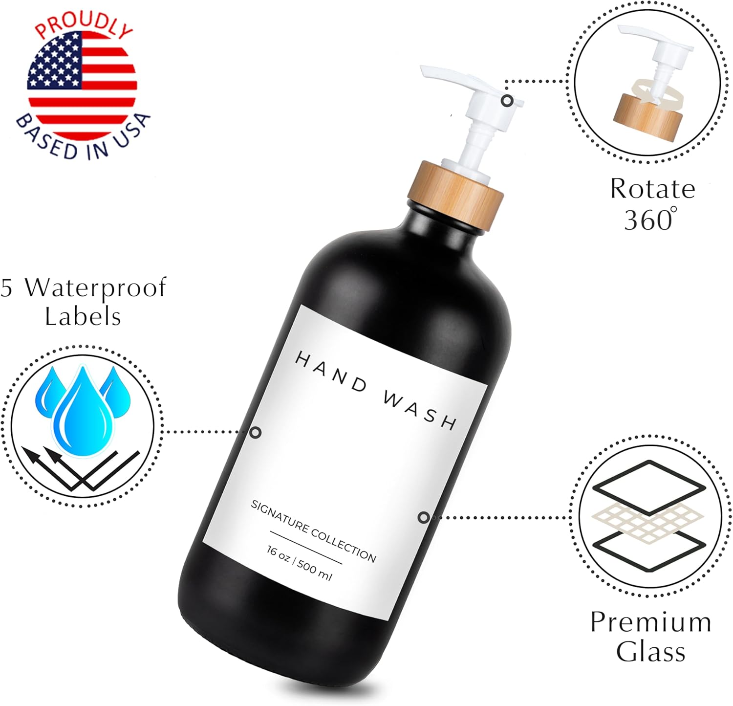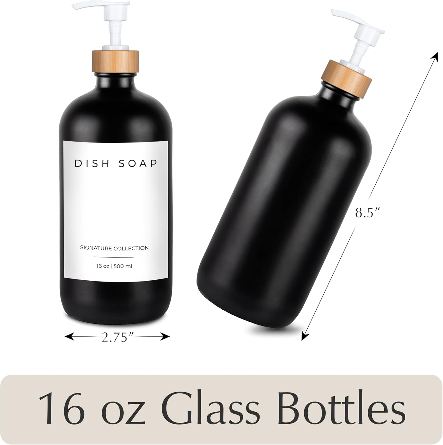 - ✅ 2-in-1 COMBO: Upgrade your home with our glass soap dispenser set. The dish soap dispensers are crafted from the highest quality glass and can be used as soap dispensers for kitchen sinks, soap dispensers for bathrooms, or as hand soap dispenser of your favorite liquid. The kitchen soap dispensers come with 2 dish soap dispensers for kitchen bottles (16 ounces), 2 stainless steel pumps, and 5 waterproof labels. Our selection includes colors including amber, clear, white, and black.