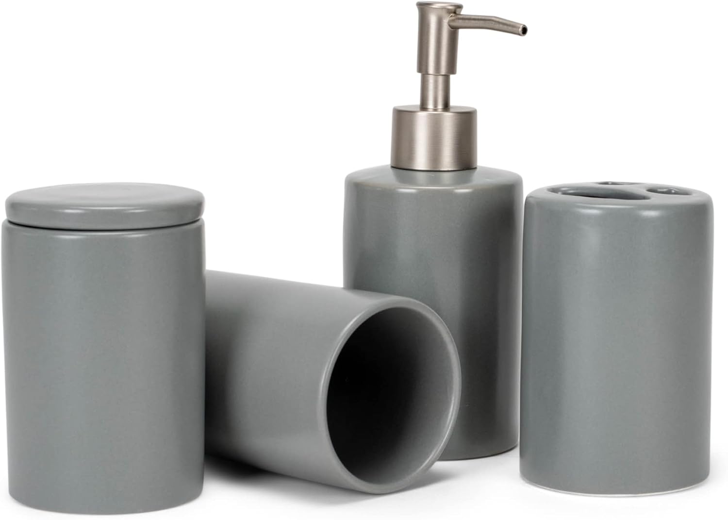 NAT & Jules Chic Modern Rounded 4.5 inch Ceramic Bathroom Accessories Set of 4 - Home Décor & Organization Perfect for Bath or Kitchen Household Essentials, Matte Grey