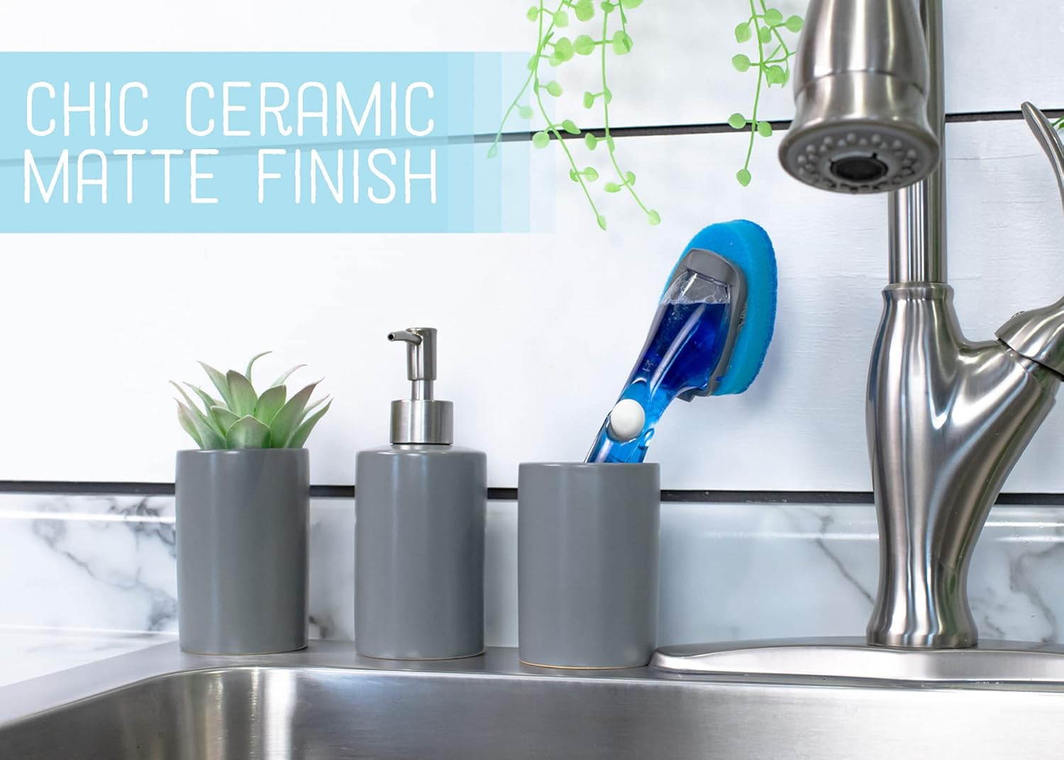 - DURABLE CERAMIC STONEWARE: With a beautiful matte cool grey finish; Hand soap dispenser features a silver tone accent pump; Essential for keeping your sink countertop tidy & organized; Handwash only.