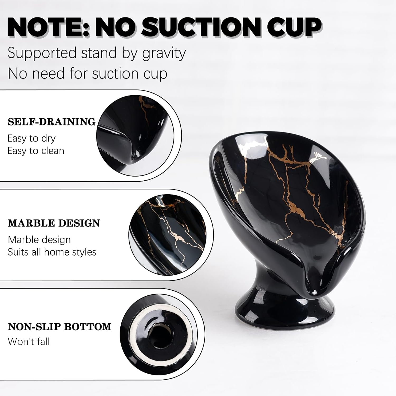 Soap Dish, Ceramic Soap Holder Self Draining Leaf Shape Bar Soap Holder, Marble Look Black Drain Soap Dish Holder for Bathroom, Easy to Clean Keeps Soap Dry, ANTIS'S HOME