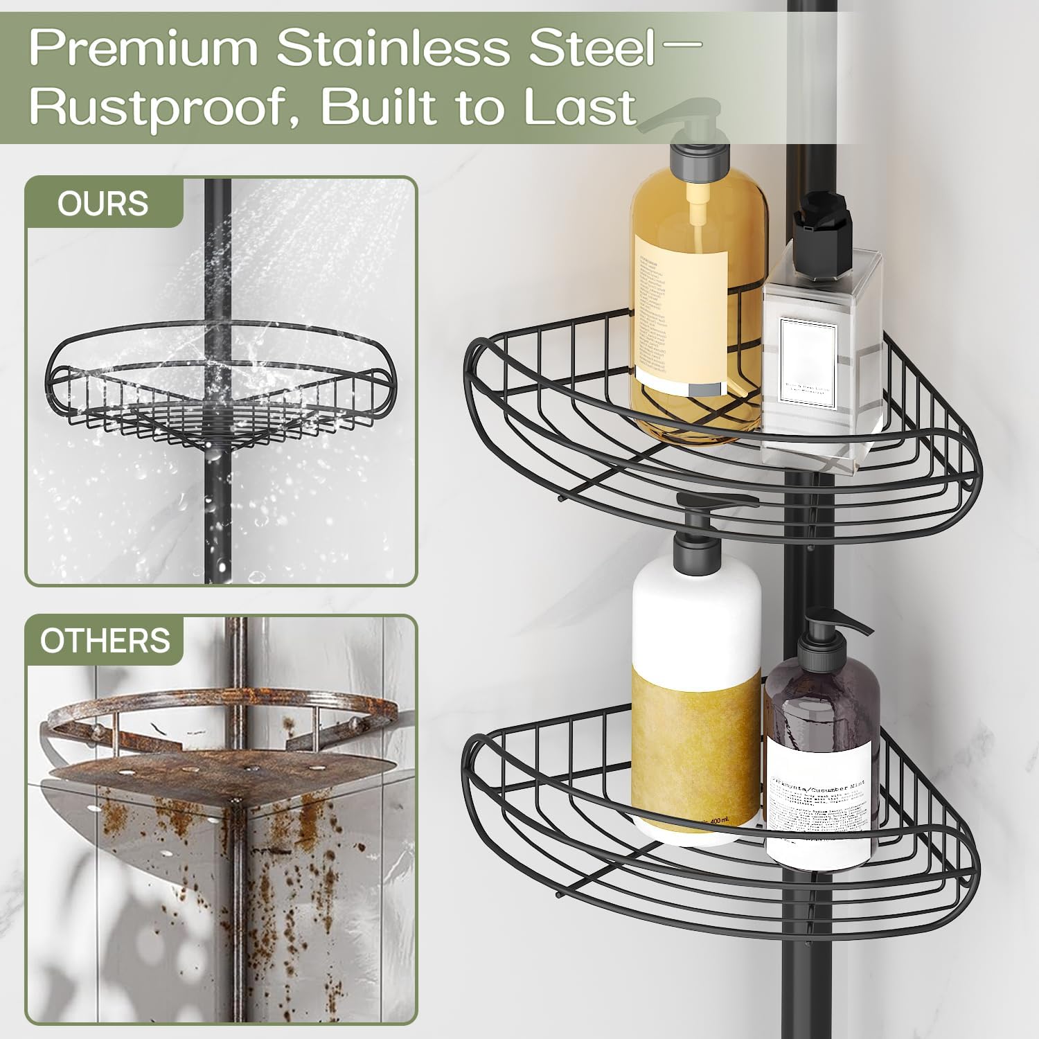 - 【Secure & Stable Tension Pole】- The shower storage for inside shower is secure and solid by adjusting the tension pole to extend the pole. The shower pole used 1’’ diameter poles and offers a strong, reliable hold that stays in place, and the plastic ends protect both ceiling and shower tile. You can use this shower shelves for inside shower above bathtub or corner shower