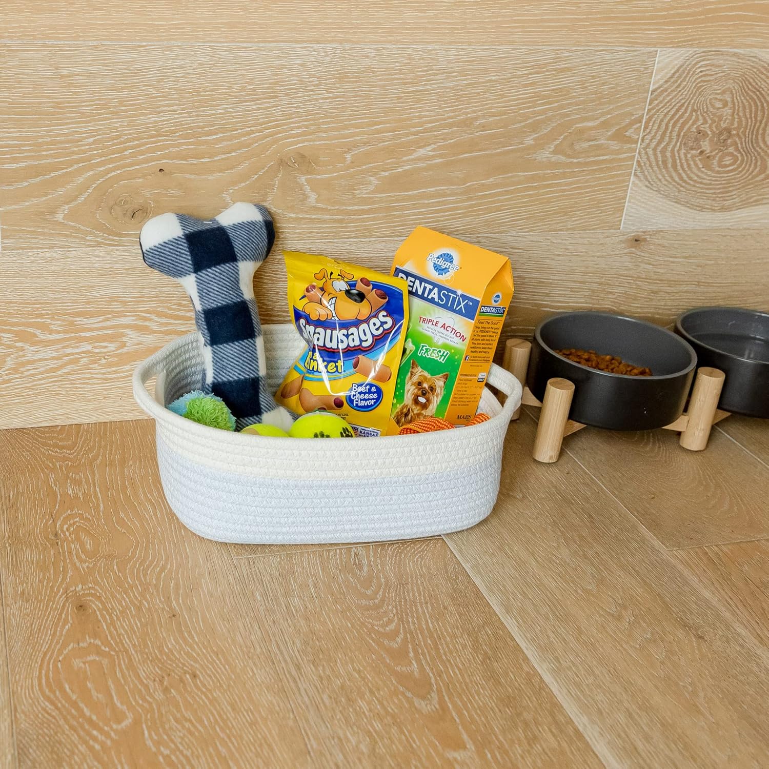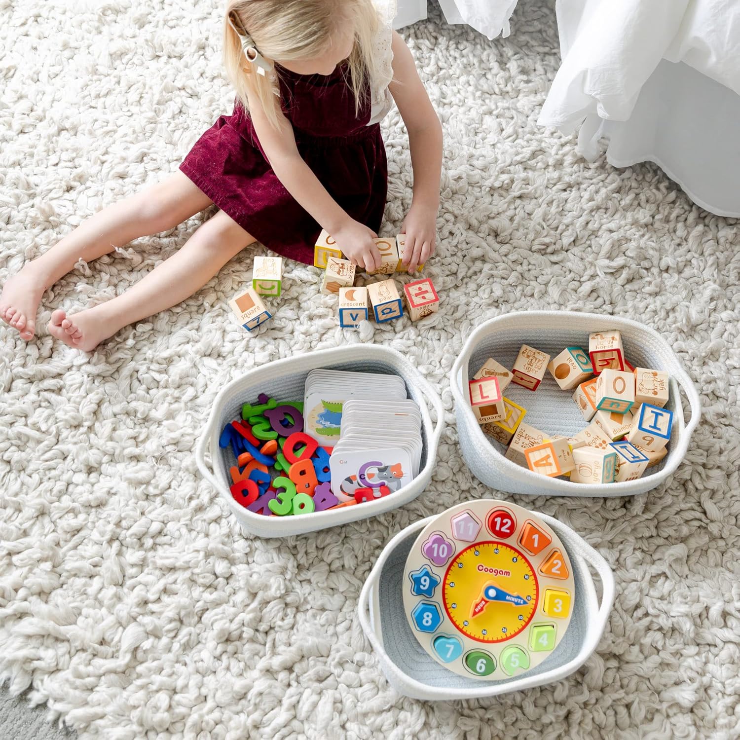 - 5 BASKETS FOR 5X THE ORGANIZING POWER: Life is messy...but your house doesn’t have to be! With 5 beautiful rope baskets for organizing, you’ll defeat messy rooms like a true supermom! Use the largest baskets for Montessori displays or countertop fruits holder, create the cutest dog toy storage or bathroom hand towel holder with the medium ones and stash jewelry or keys in the smallest. Biggest (11.8"x8.7"x4.3"), (11"x7.9"x3.9"), (10.2"x7.1"x3.5"), (9.1"x6.3"x3.1"), Smallest (7.9x5.5"x2.8")