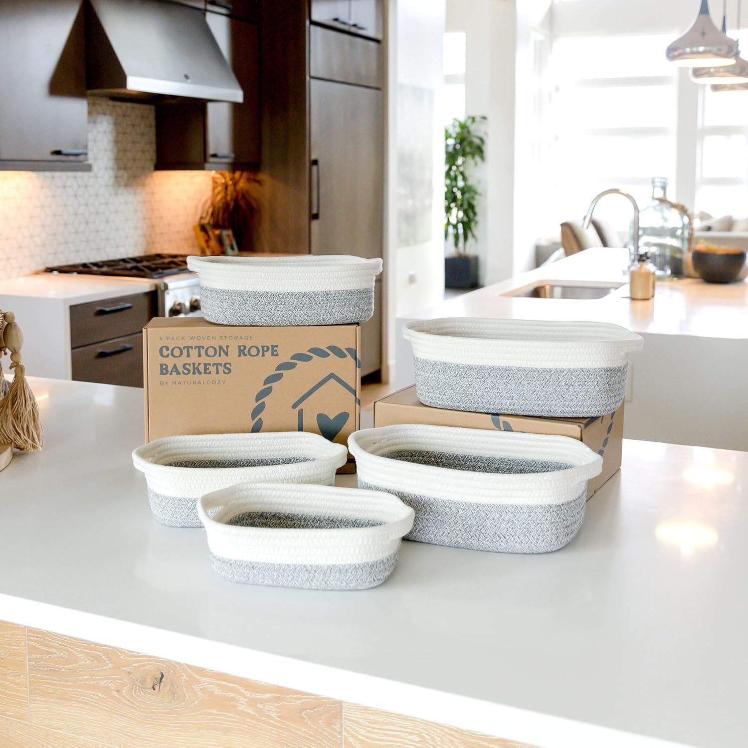 NaturalCozy 5-Piece Rectangle Storage Basket Set- Natural Cotton Rope Woven Baskets for Organizing! Small Basket for Montessori, Baby Nursery, Dog Toy Baskets, Cat Toy Box, Bathroom Organization Bin