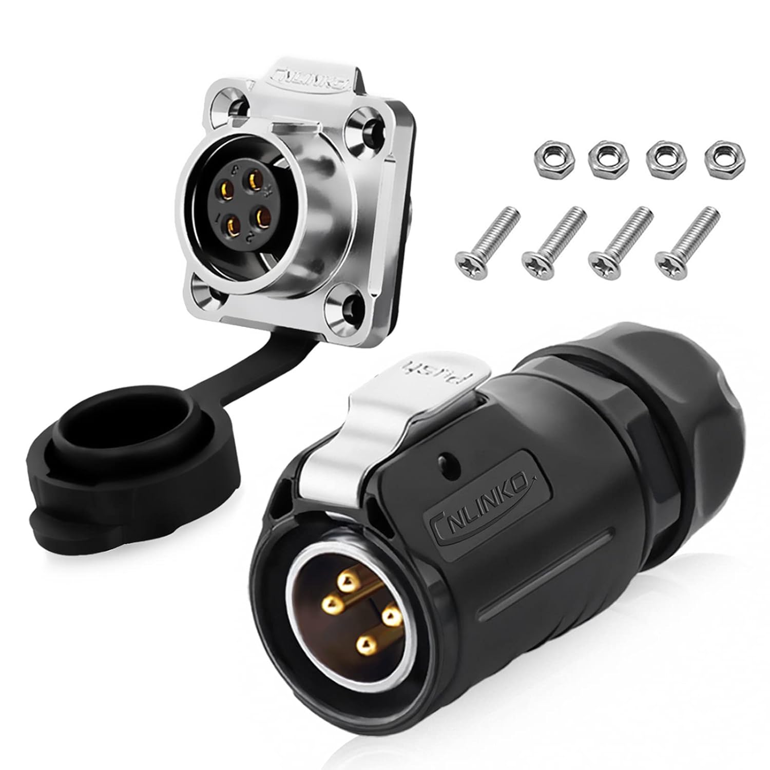 - High-Quality Material: 4 pin waterproof connector uses a PBT material shell that is imported from abroad with stability, compression, anti-explosion, and anti-deformation. Use zinc alloy material flanges seat, against high-frequency noise and electromagnetic interference. Using gold-plated contact with the superior performance of corrosion resistance and electrical conductivity effectively deals with temperature rise.