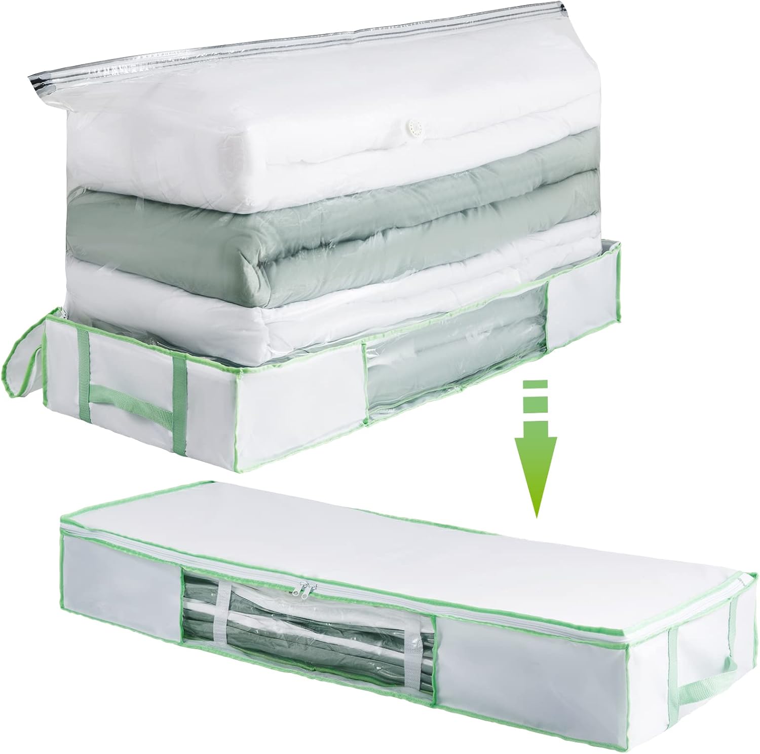- Super Large Capacity: The underbed storage box comes with a jumbo size space saver bag (53*27.5*17.7 inches), holding 3-4 king size comforters, 4-5 pillows and 3-4 quilts, double safe belts secure a better storage and protection