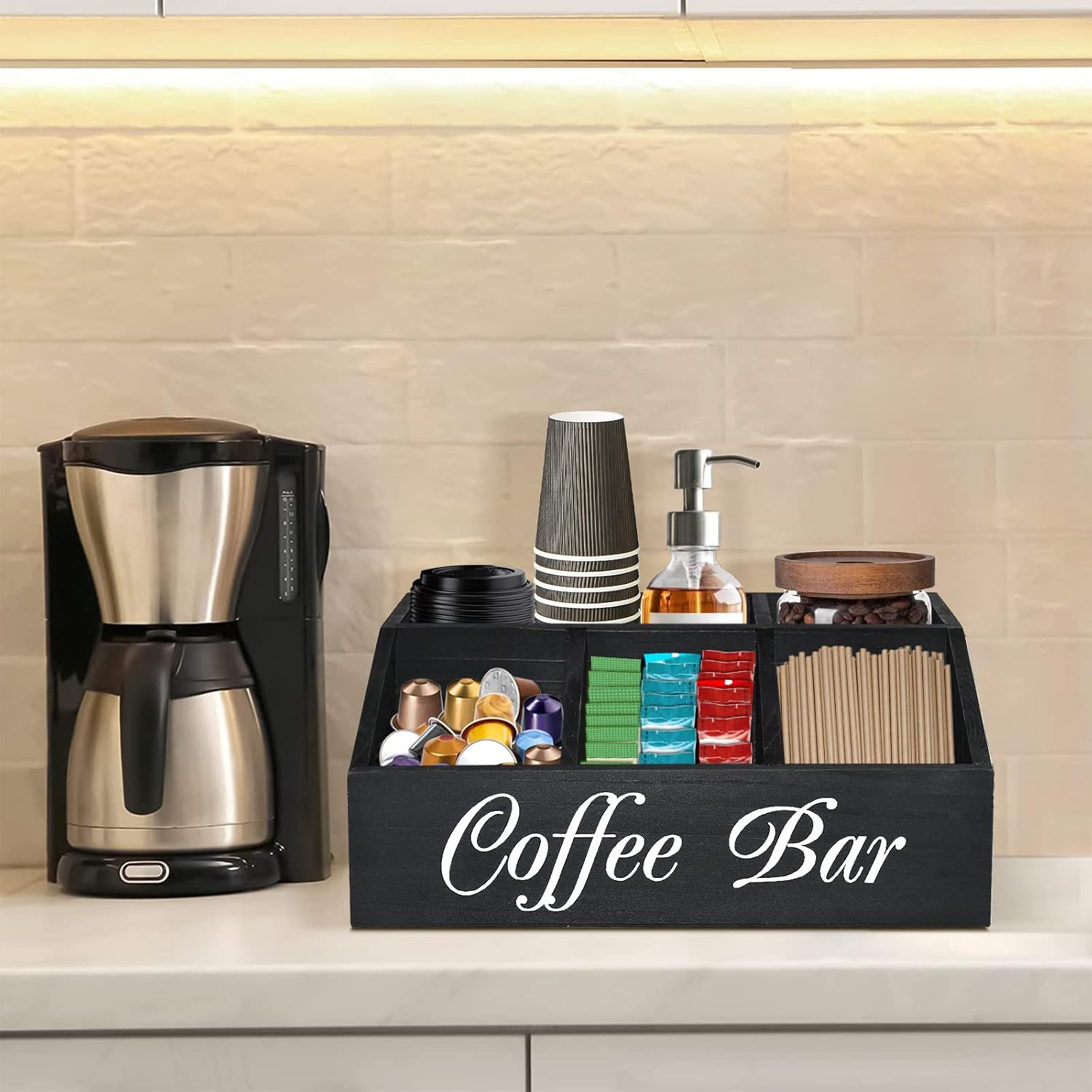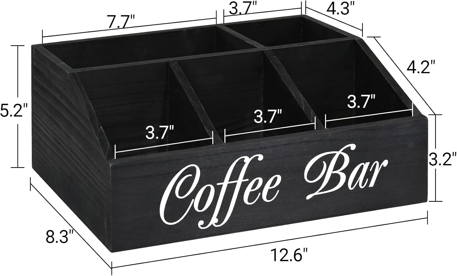 - COFFEE STATION ORGANIZER: The simple design provide a multifunctional coffee station organizer perfect for creating a clean and organized coffee space. This coffee bar organizer has 5 spacious compartments, the front 3 large capacity compartments can be used to store coffee pods, sugar, tea bags, instant coffee and more, and the rear two compartments have enough height to store your stack Coffee cups, straws, stir sticks, canned coffee beans, etc.