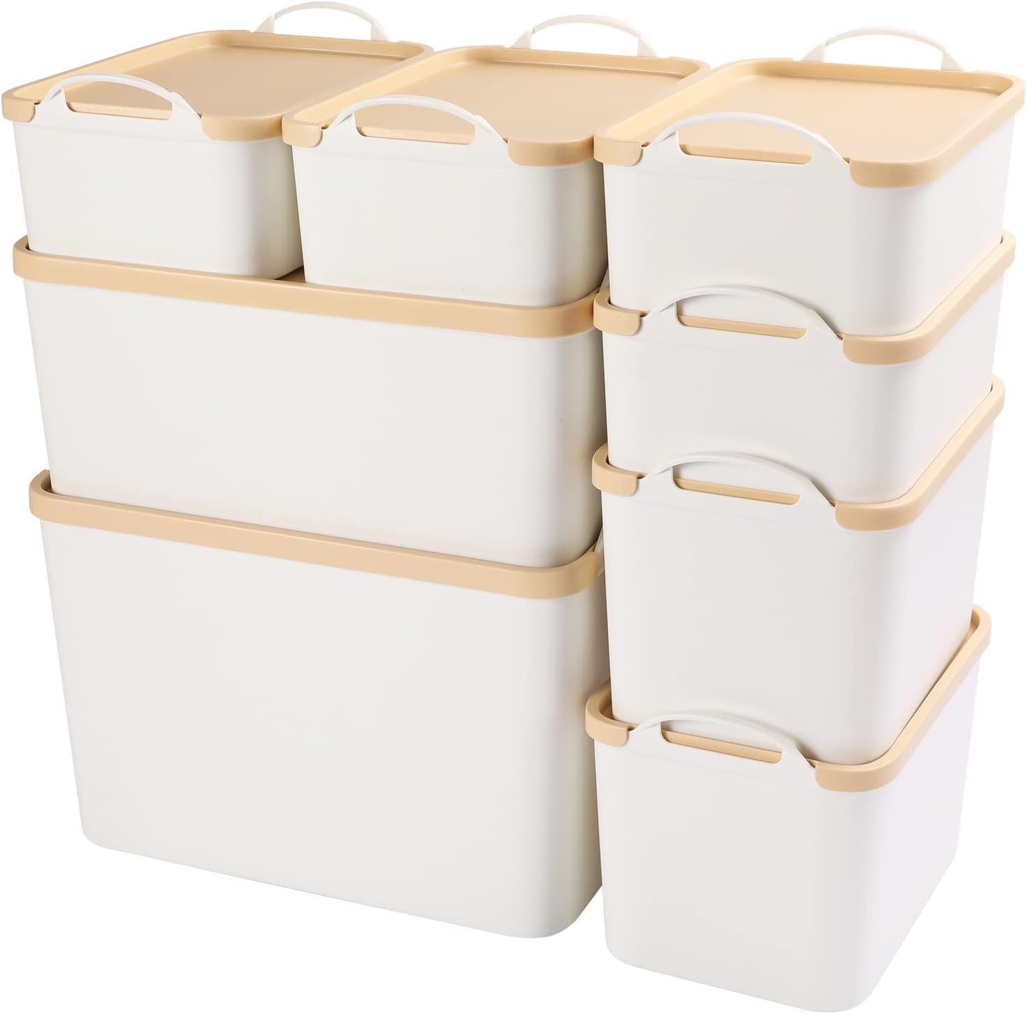 ANMINY 8PCS All-in-One Lidded Plastic Storage Bins Set White Desk Basket Box Drawer Organizer Kitchen Food Container with Handles Removable Lids Decorative Clothes Laundry Closet Cabinet Shelf Cube