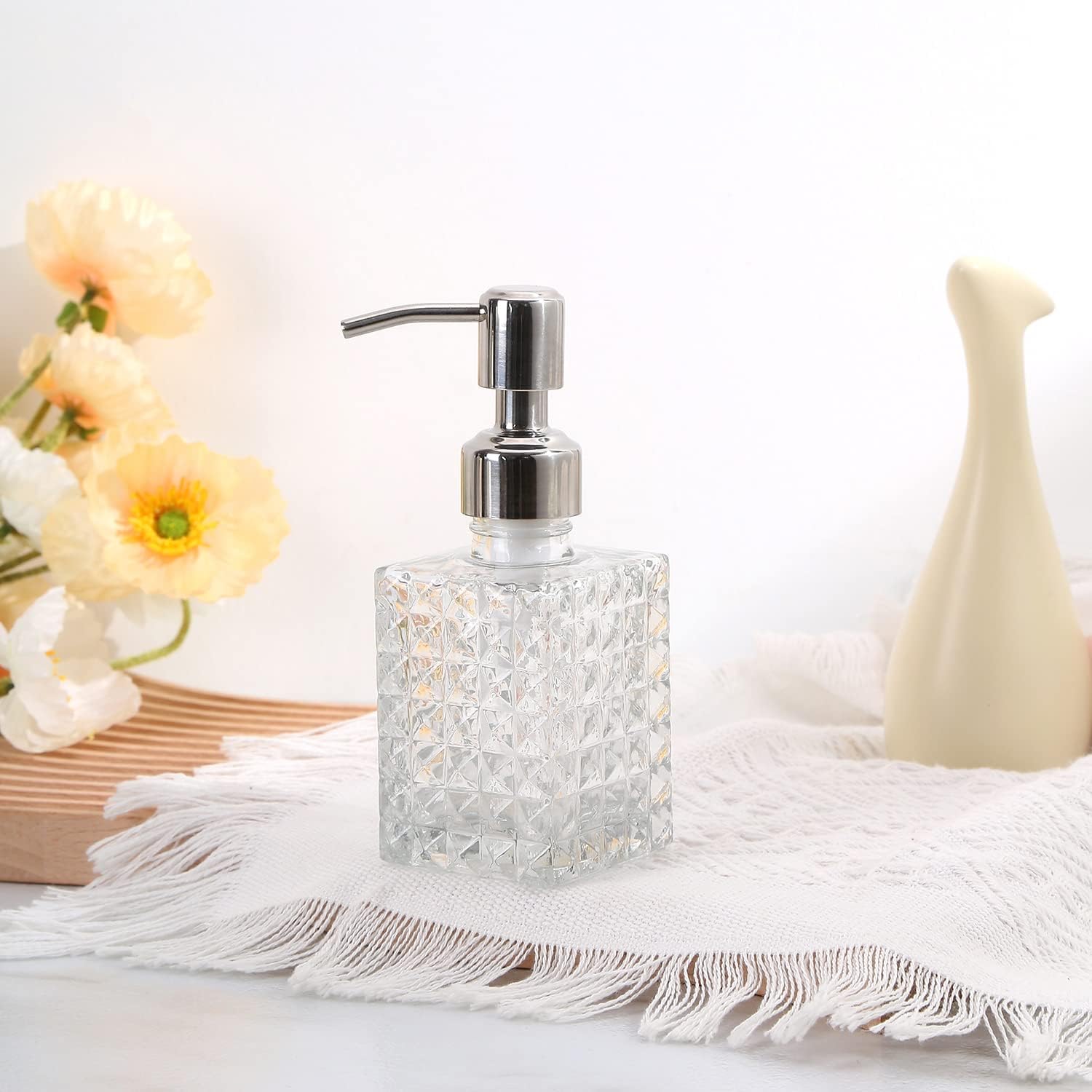 - Cut-Glass Dispenser: Stylish glass soap dispenser with pattern, perfect for soap, lotion, hand soap, dish soap, etc.