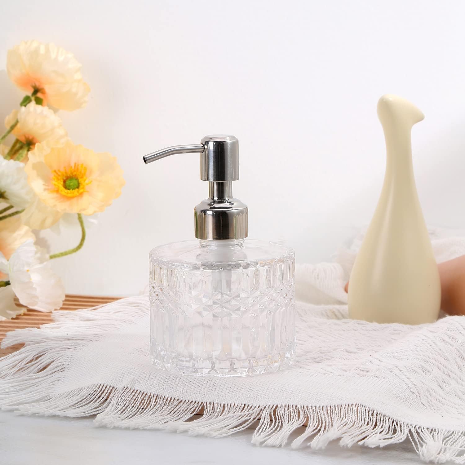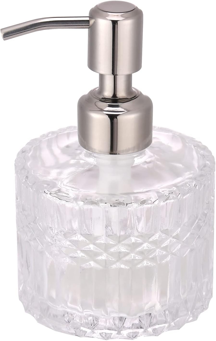 - Cut-Glass Dispenser: Stylish glass soap dispenser with pattern, perfect for soap, lotion, hand soap, dish soap, etc.