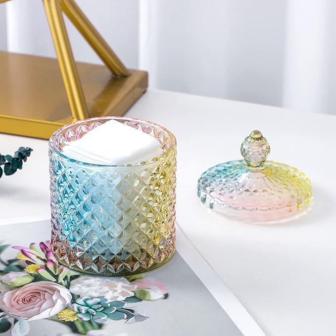 Qtip Holder Glass Apothecary Jars with Lid Bathroom Accessories Vanity Organizers and Makeup Storage for Cotton Swabs, Makeup Sponges, Bath Salts, Canister Dispenser, 2 Pack Rainbow