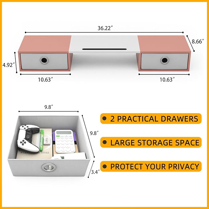 - 【Monitor Stand with 2 Drawers】Our computer monitor riser includes practicality slide-out drawers, for storing items like post-it notes, writing utensils and mobile devices.