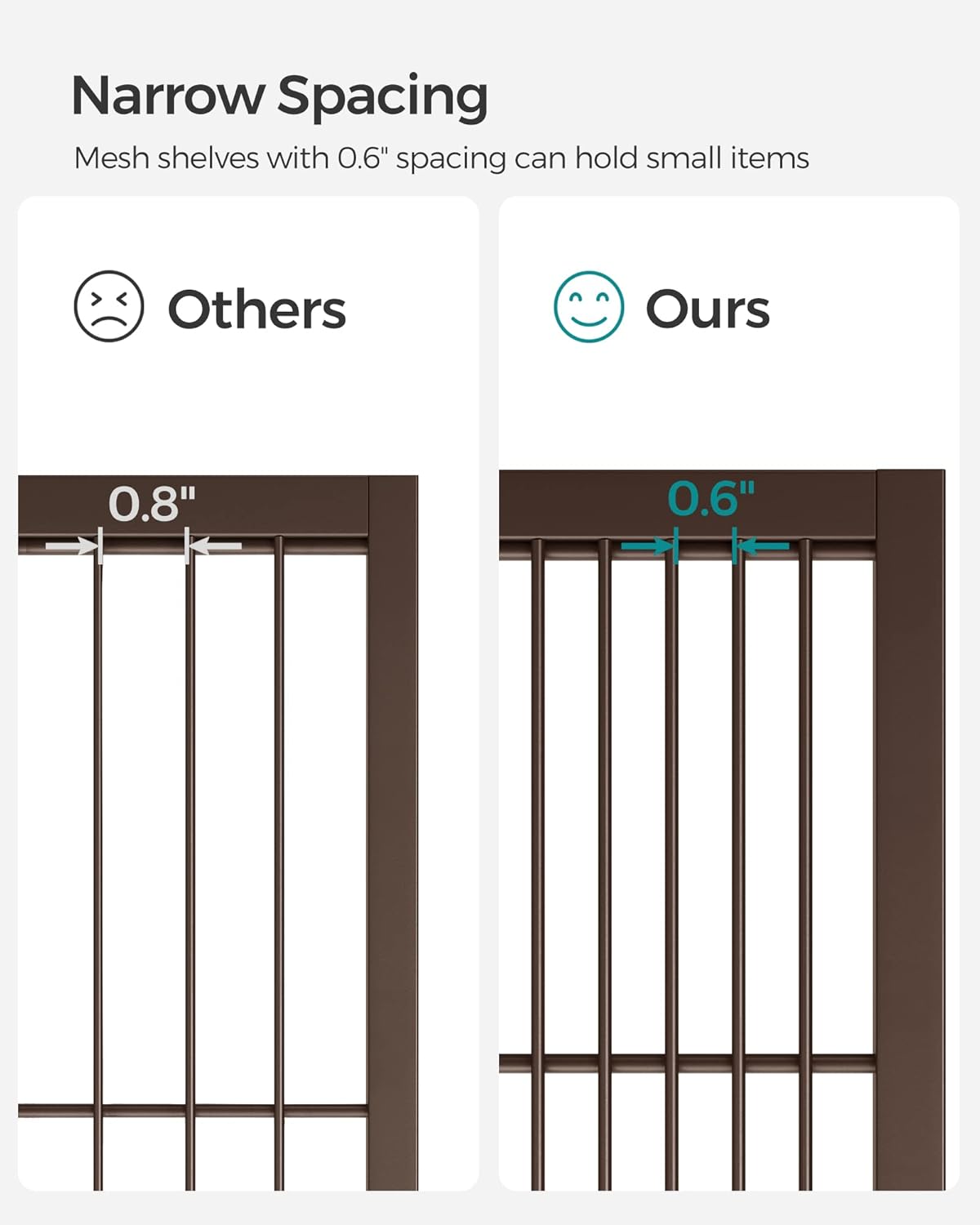 - [Reliable Support for Your Items] Dense mesh shelves with 0.6" (1.5 cm) spacing fit even small items. The strong steel frame boasts high strength for firm support (with casters, max. 44 lb (20 kg) per shelf; with adjustable feet, max. 110 lb (50 kg) per shelf)