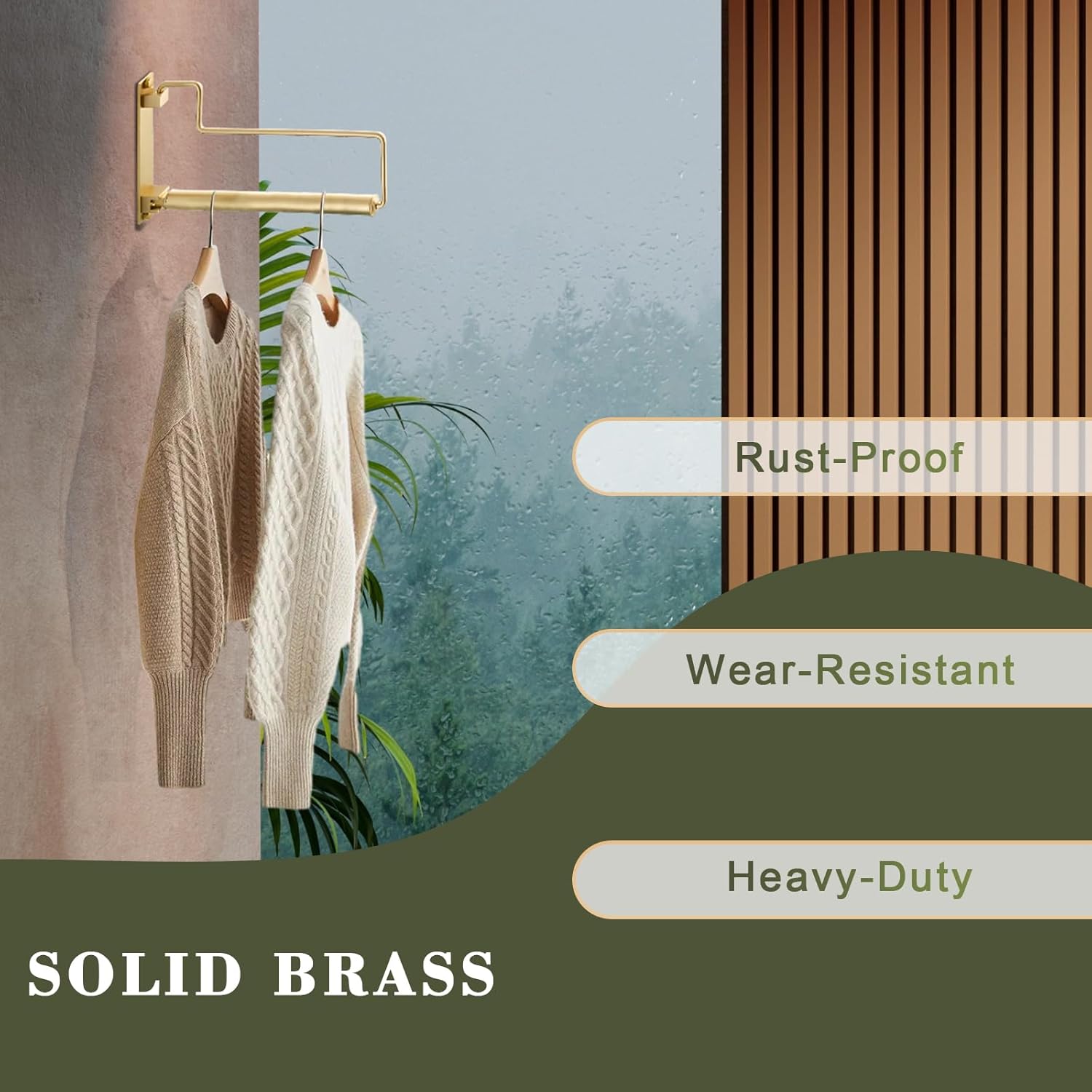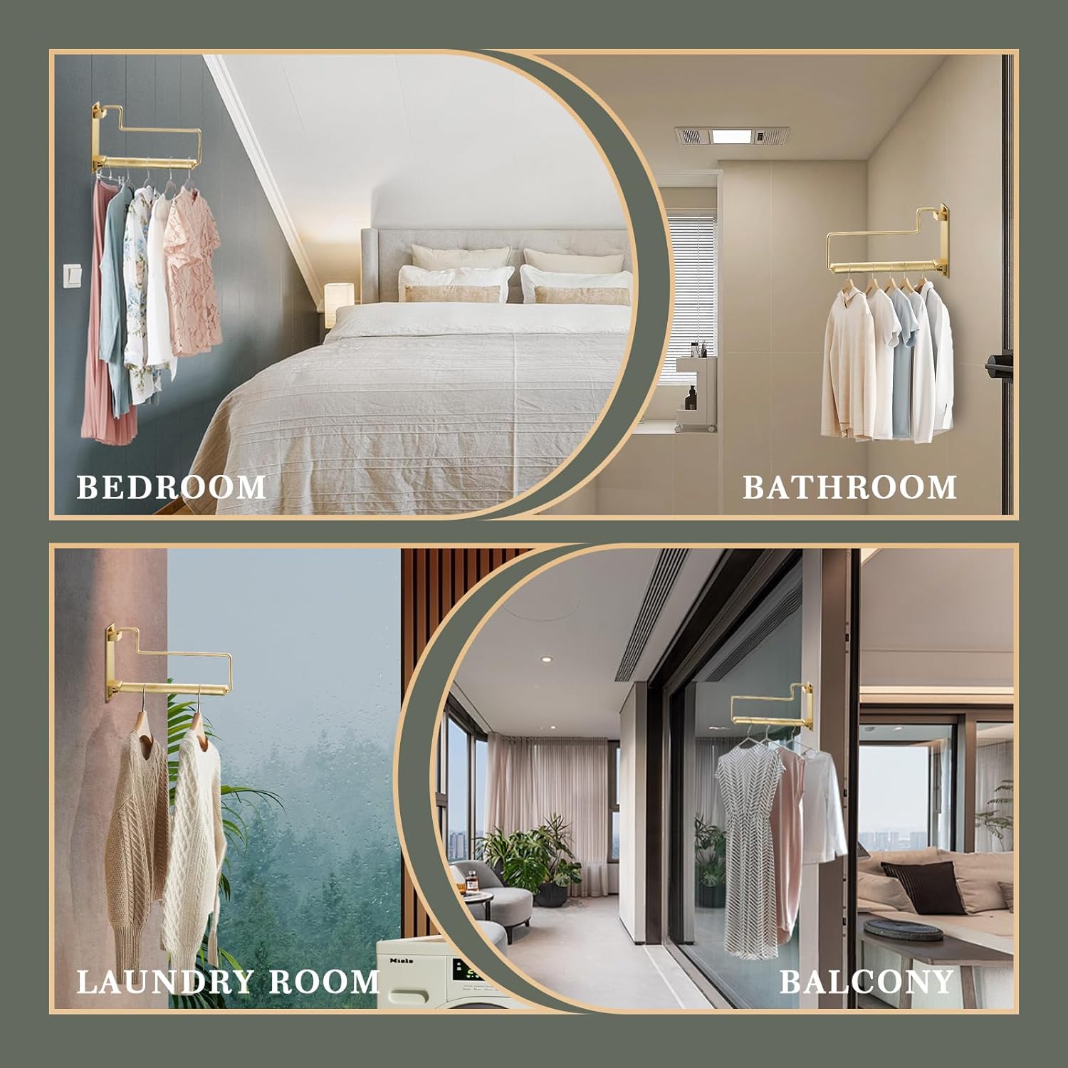 NEWRAIN Clothes Drying Rack, Laundry Racks for Drying Clothes, Wall Mounted Swing Arm Clothes Hanger for Laundry Room, Garage, Indoor & Outdoor Use,Brushed Gold