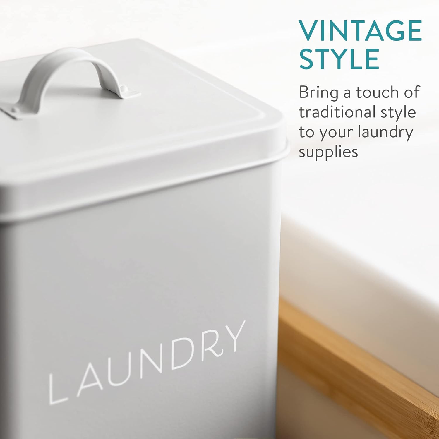 - LIGHTWEIGHT: The container is made of lightweight powder coated zinc and iron, for a metal tin that's both sturdy and easy to move around. Handles on the side help to carry the box to your washing machine.
