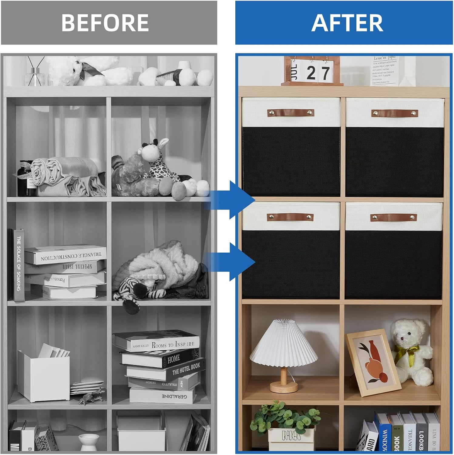 Temary Fabric Storage Bin 4 Pack Cube Storage Bin for Shelf Fabric Cube Storage Basket 13 Inch Cube Storage Bins Foldable Storage Cubes with Leather Handles(White&Black)