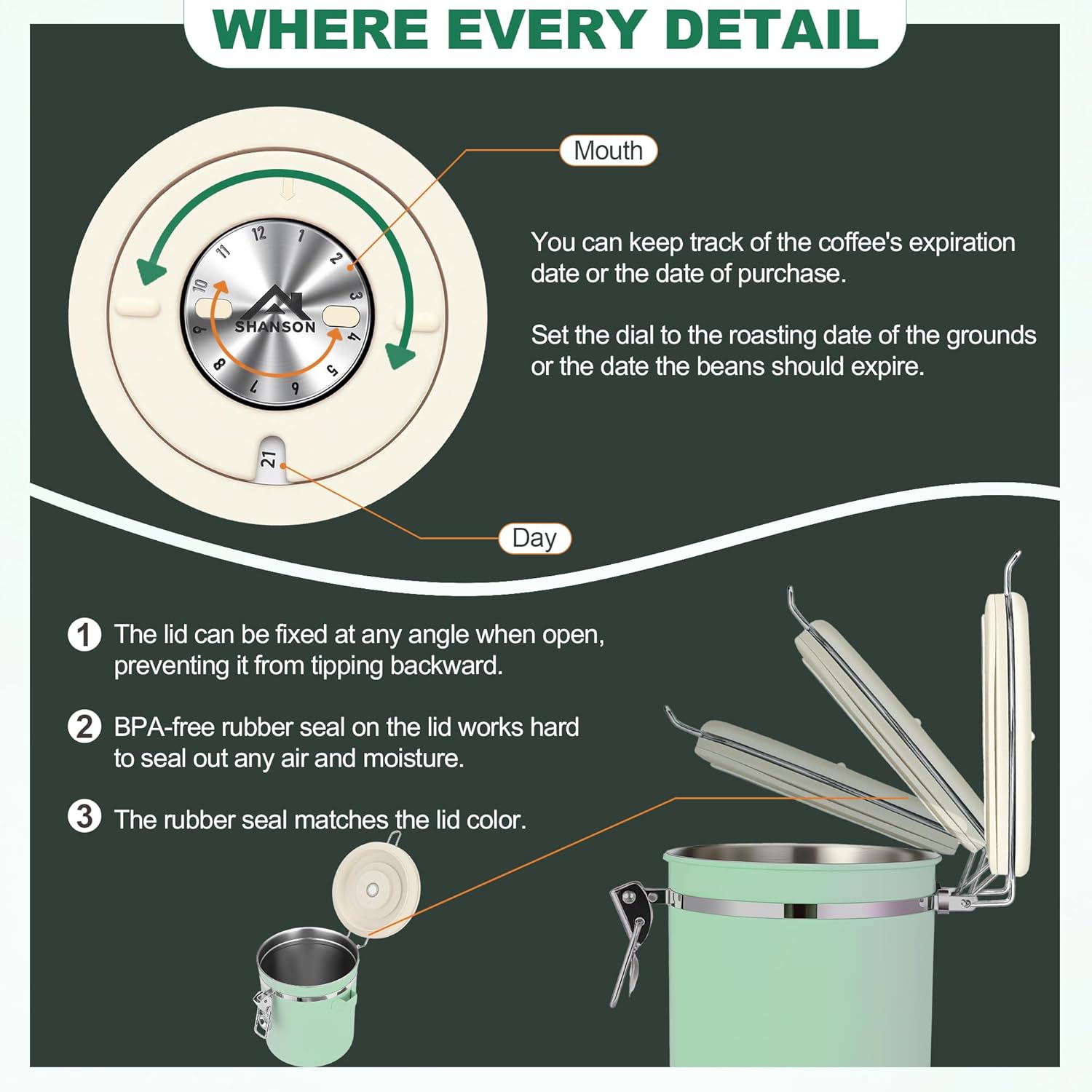 ShanSon Coffee Canister Airtight Coffee Container Stainless Steel Coffee Bean Storage Container with Scoop Coffee Canister for Beans Grounds Sugar Flour Tea Cereal,16OZ,Green