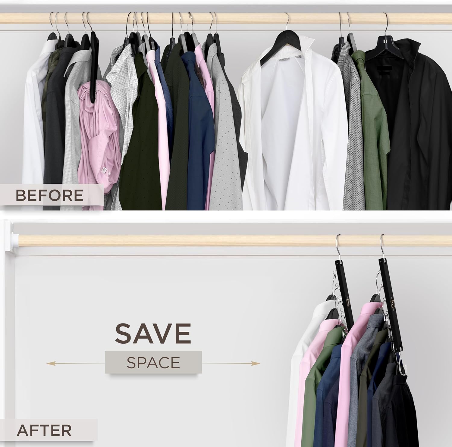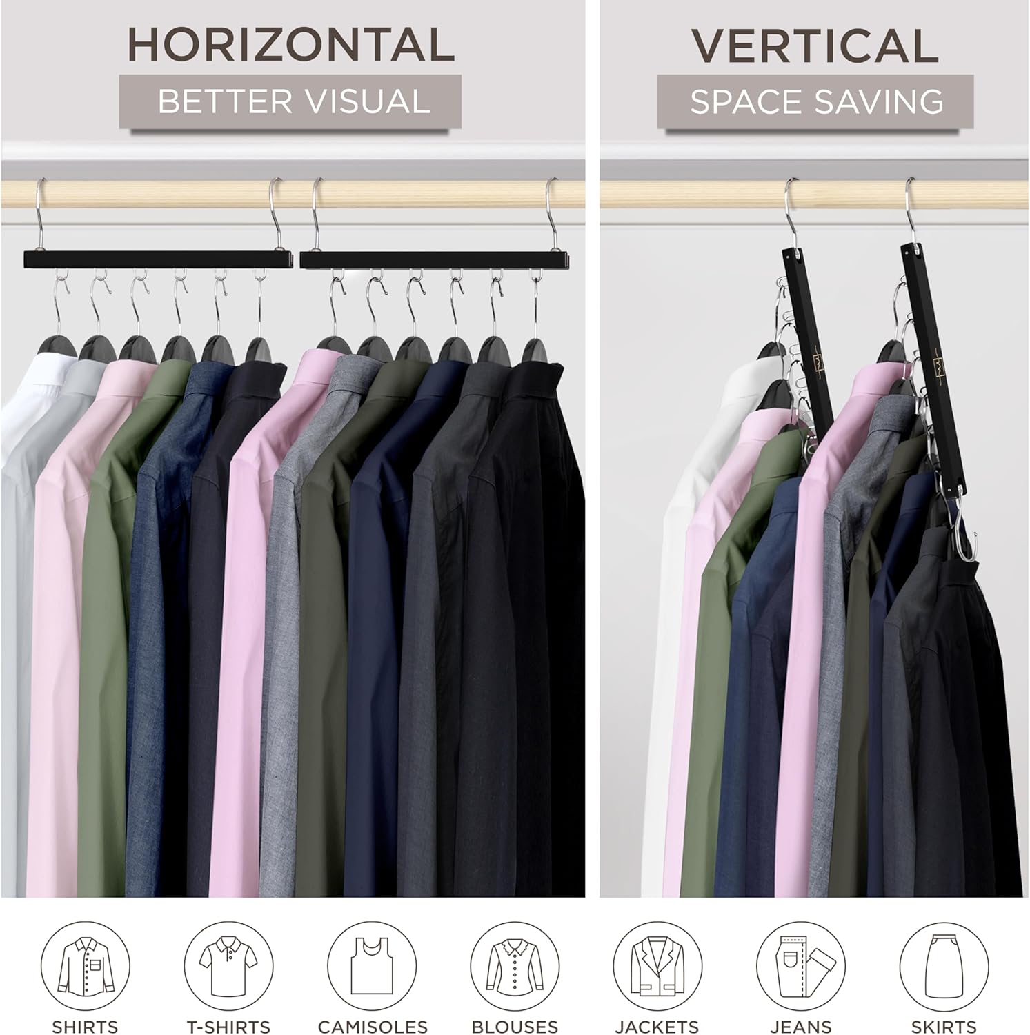 - MULTIUSE SPACE SAVING ORGANIZATION - Our clothes hangers space saving wardrobe organizer set goes beyond a multi shirt hanger. A purse organizer hanger, coat hangers space saving organizer, tank top hangers space saving storage, baby clothes hanger organizer and more they can be used as hangers for small closets and large closets.