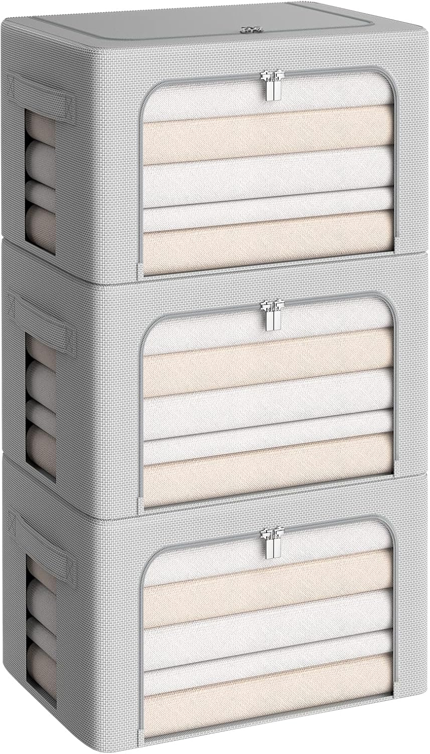 3Pack Frame Storage Box - Clothes Storage Bin Bags Oxford Fabric Foldable Stackable Container Organizer Set with Clear Window & Carry Handles (Grey, X-Small-36L)