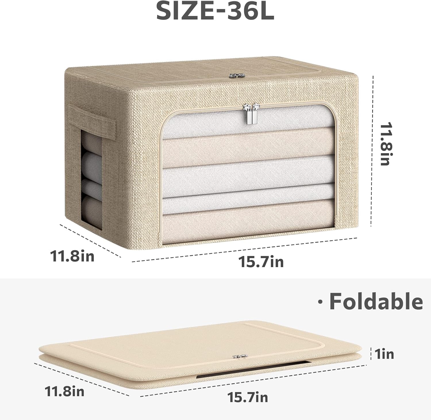 3Pack Foldable Storage Bins - Frame Storage Box Linen Fabric Stackable Clothes Container Organizer with Clear Window & Carry Handles Large Capacity (Medium-36L, Beige)